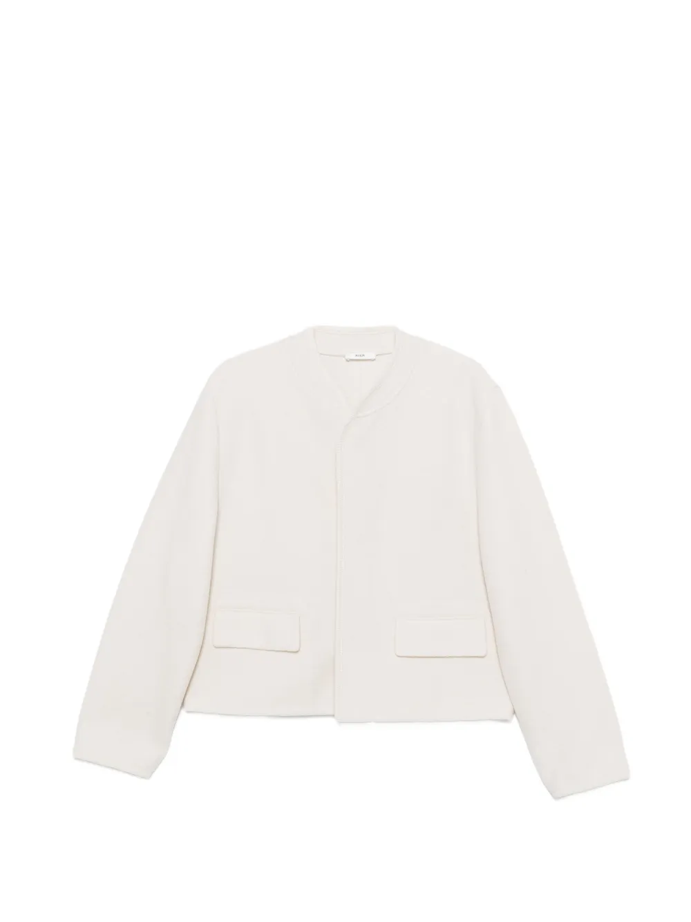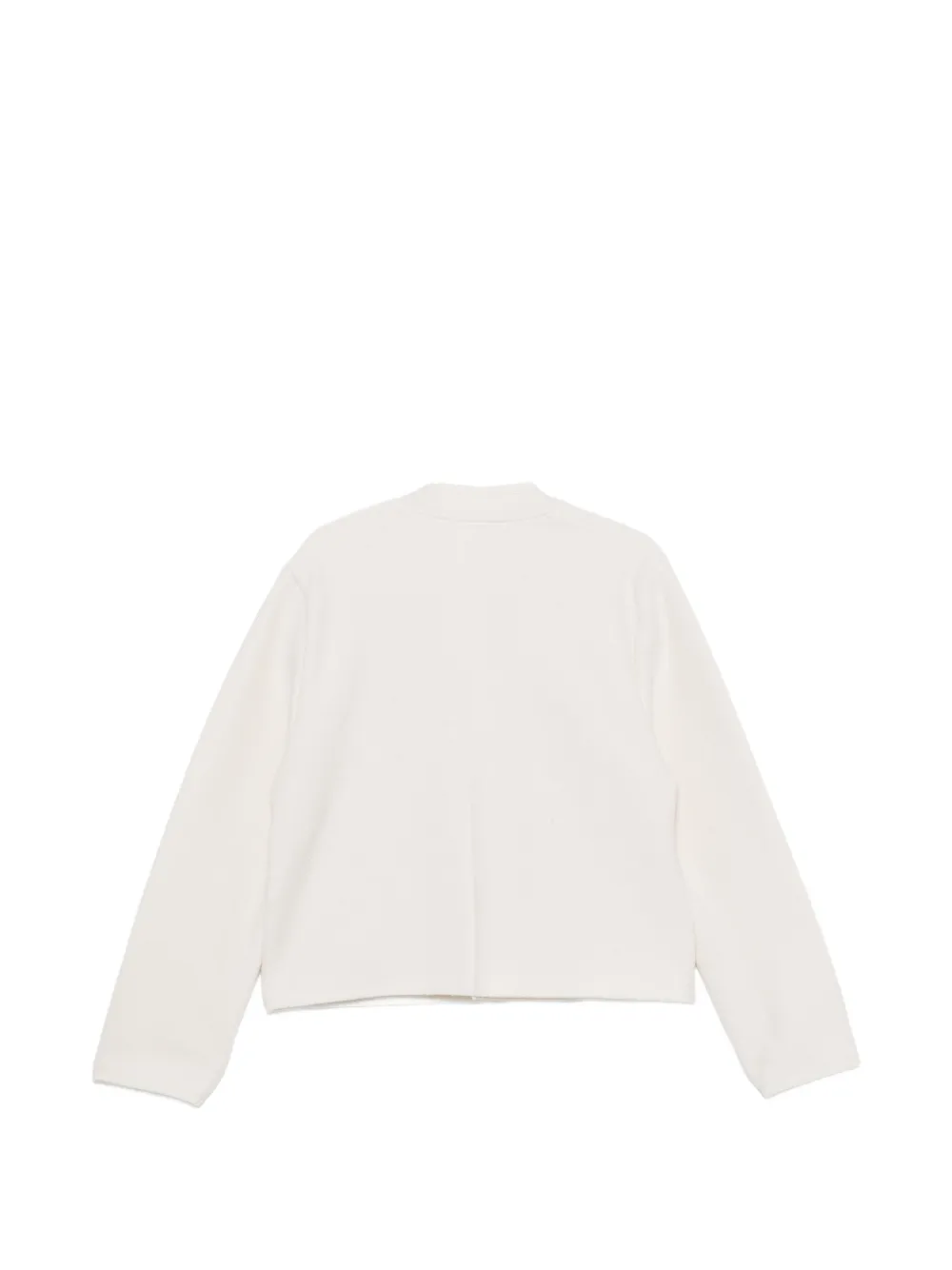 white virgin wool felted texture round neck long sleeves two front flap pockets straight hem