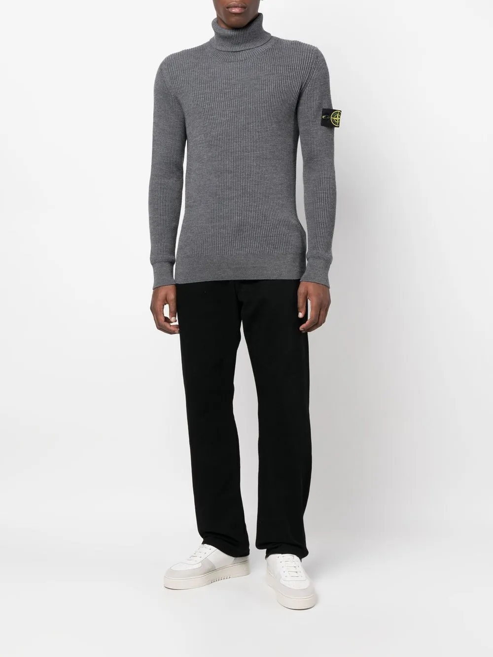 Grau, Wolle, gerippter Strick, ikonisches Kompass-Motiv, Logo-Patch am Arm, Rollkragen, lange Ärmel, gerader Saum.