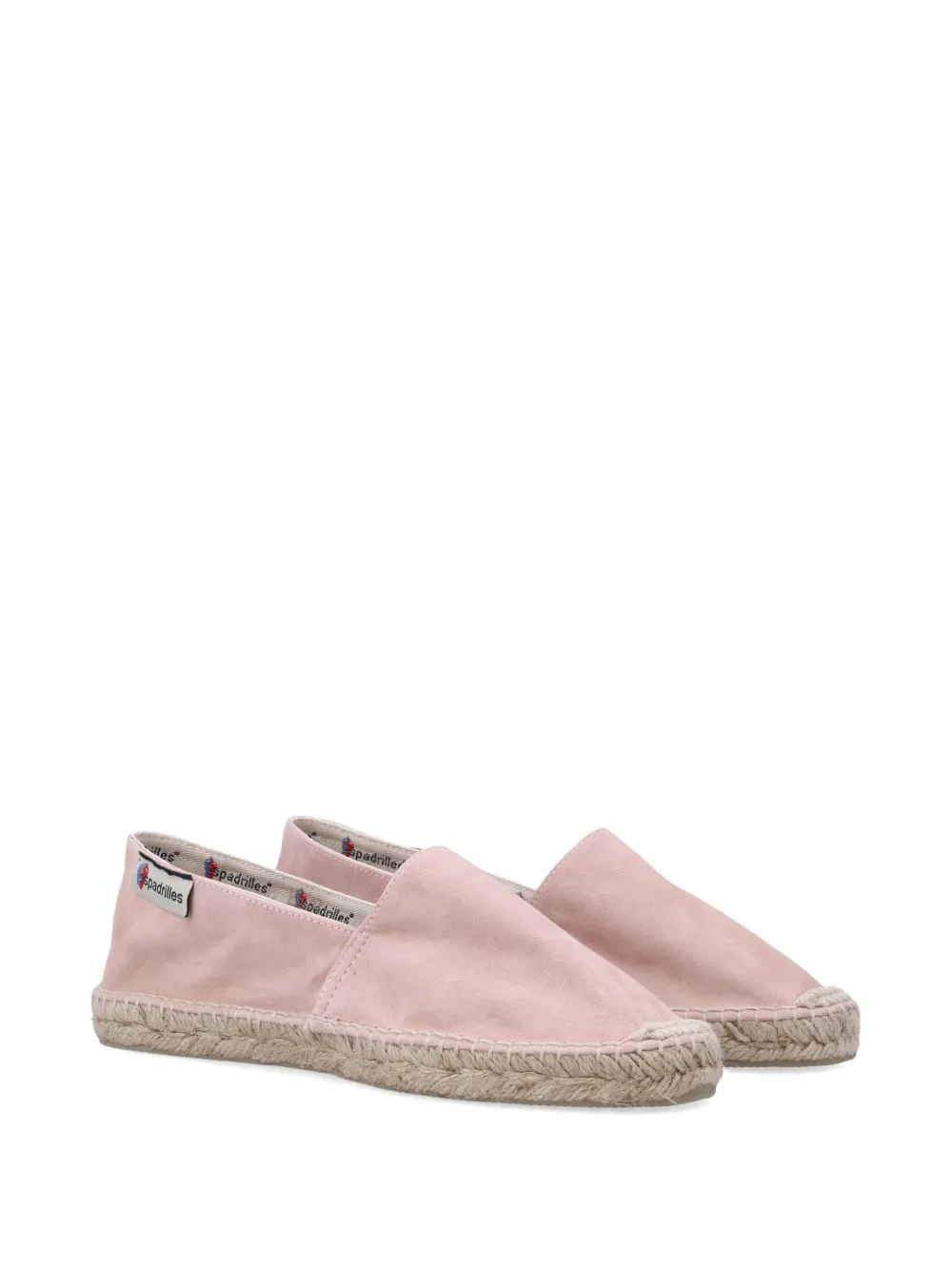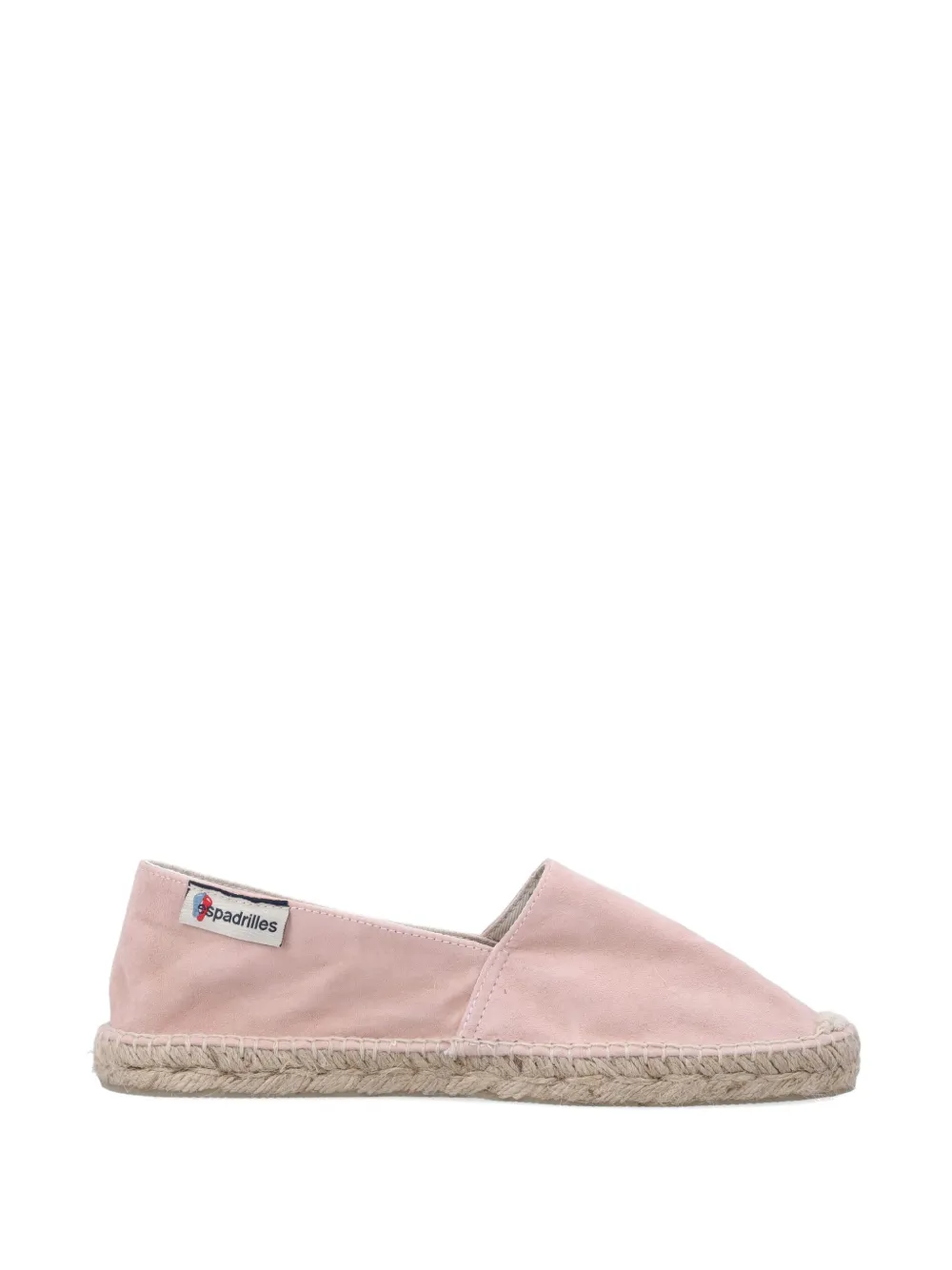 candy pink suede texture tonal stitching logo patch to the side braided raffia midsole flat rubber sole