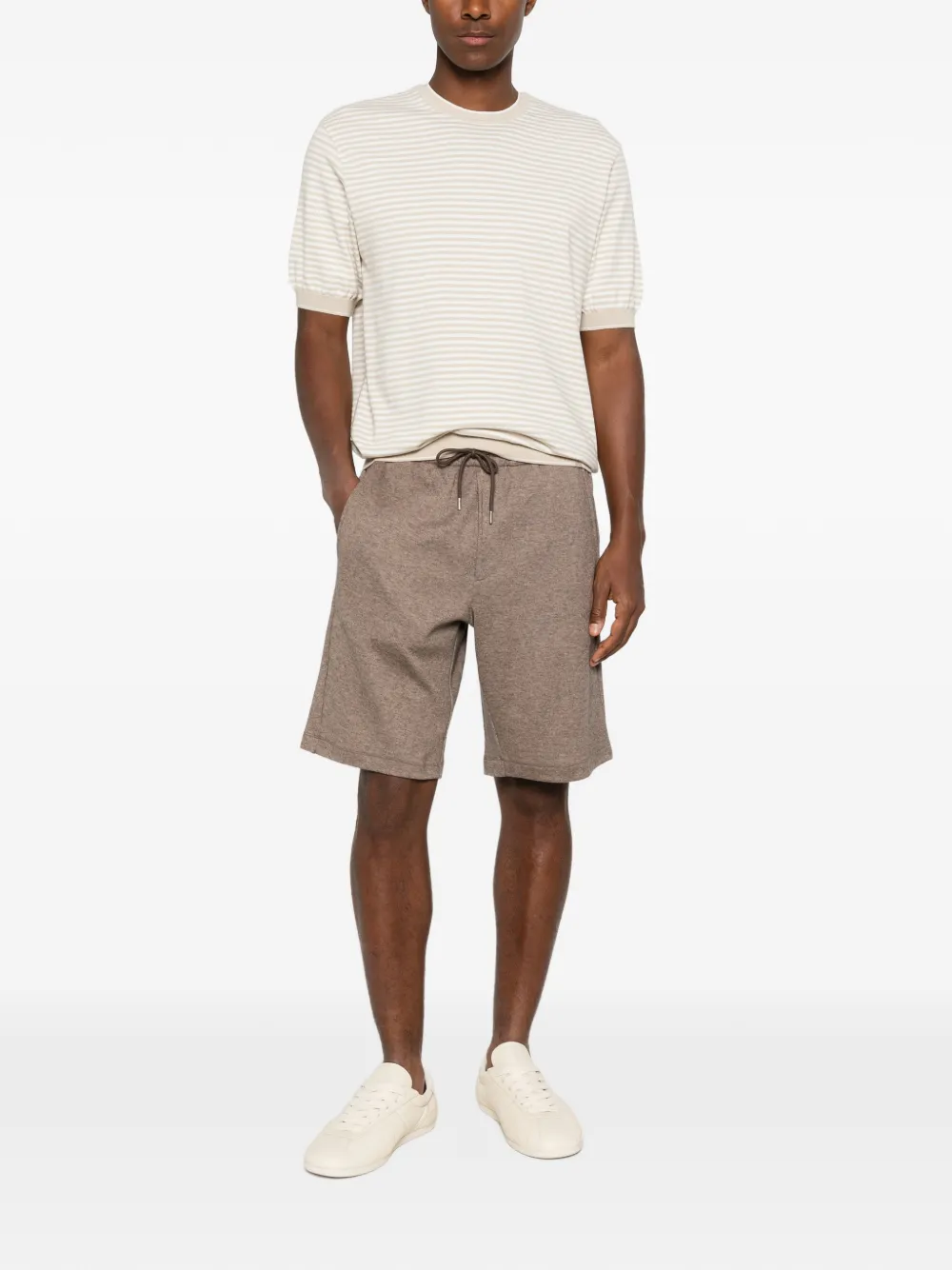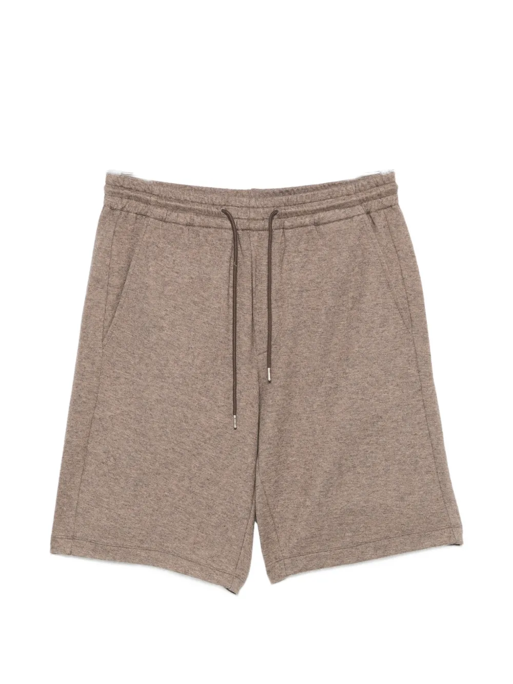 brown elasticated waistband drawstring fastening side slit pockets rear patch pockets straight hem