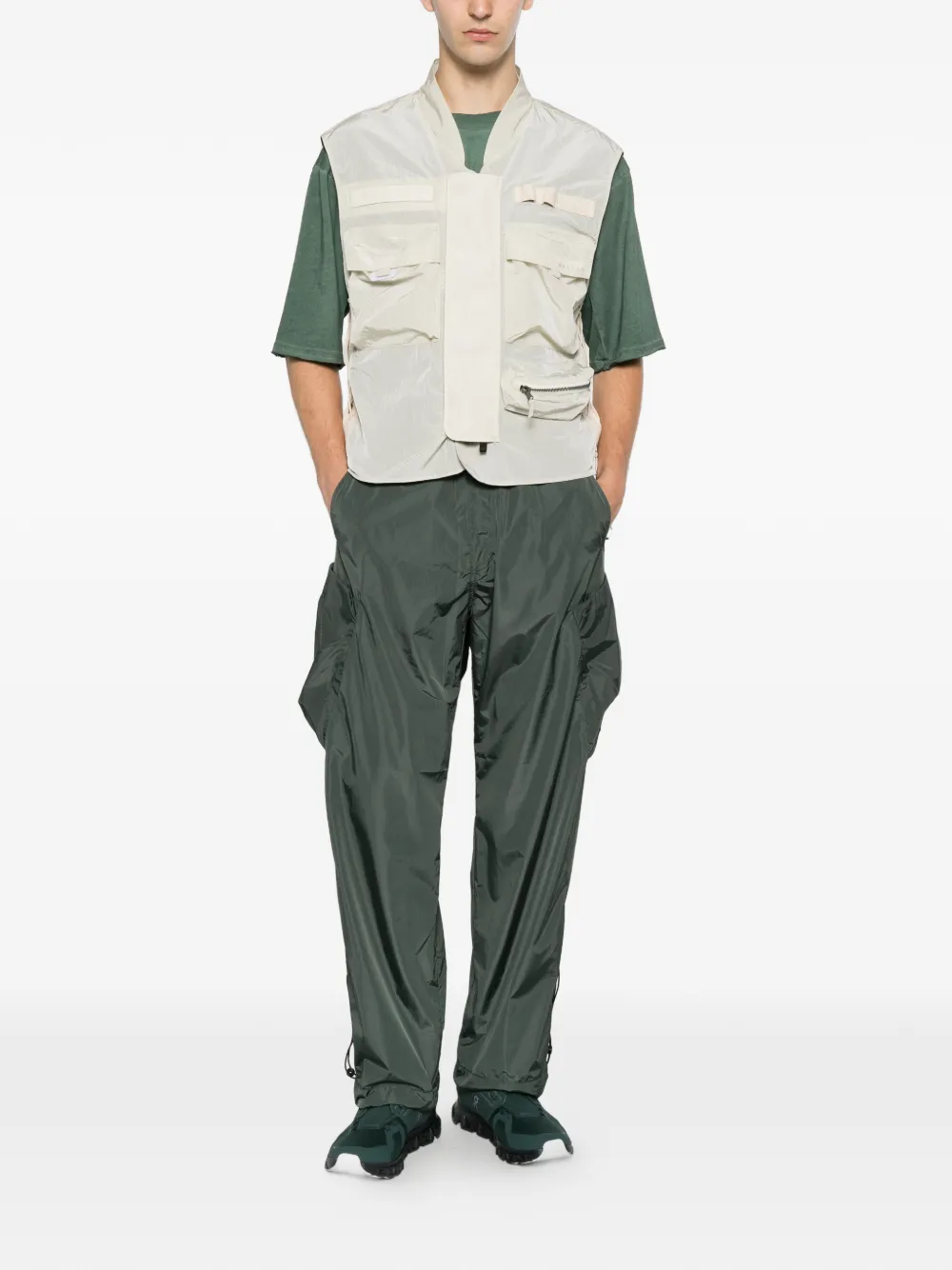 mist green ripstop texture elasticated waistband two side slit pockets two side cargo pockets drawstring cuffs logo print to the side