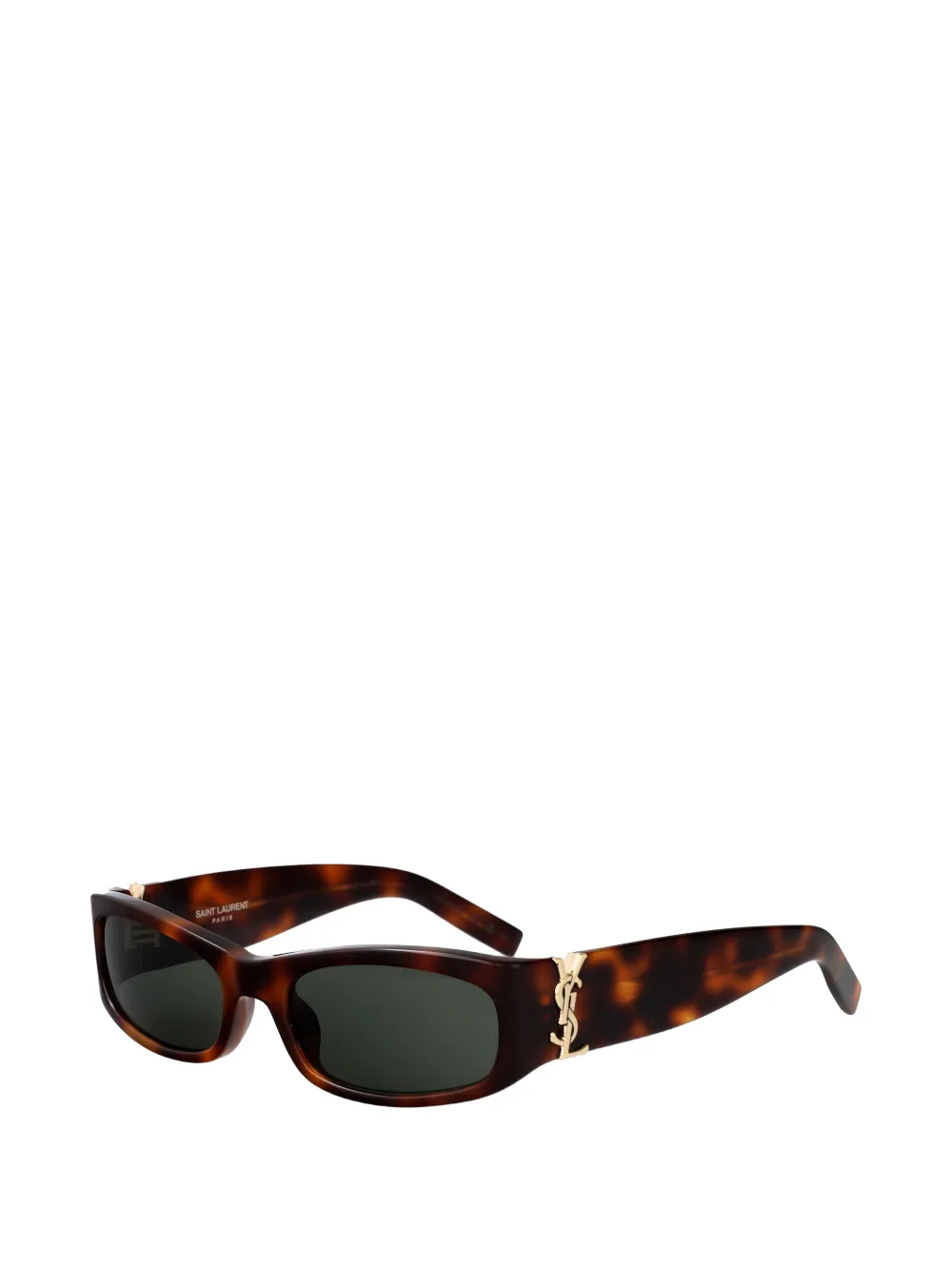 brown tortoiseshell effect rectangle frame tinted lenses gold-tone YSL Monogram at the hinges curved arms These glasses come with a protective case.