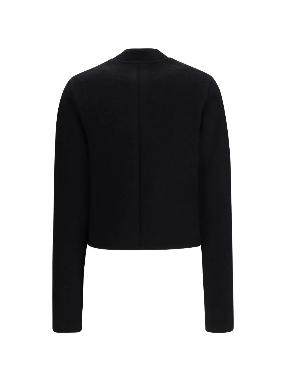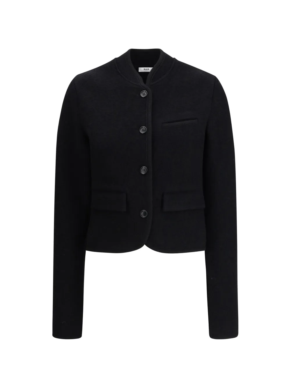black button fastening chest pocket two front pockets long sleeves round neck