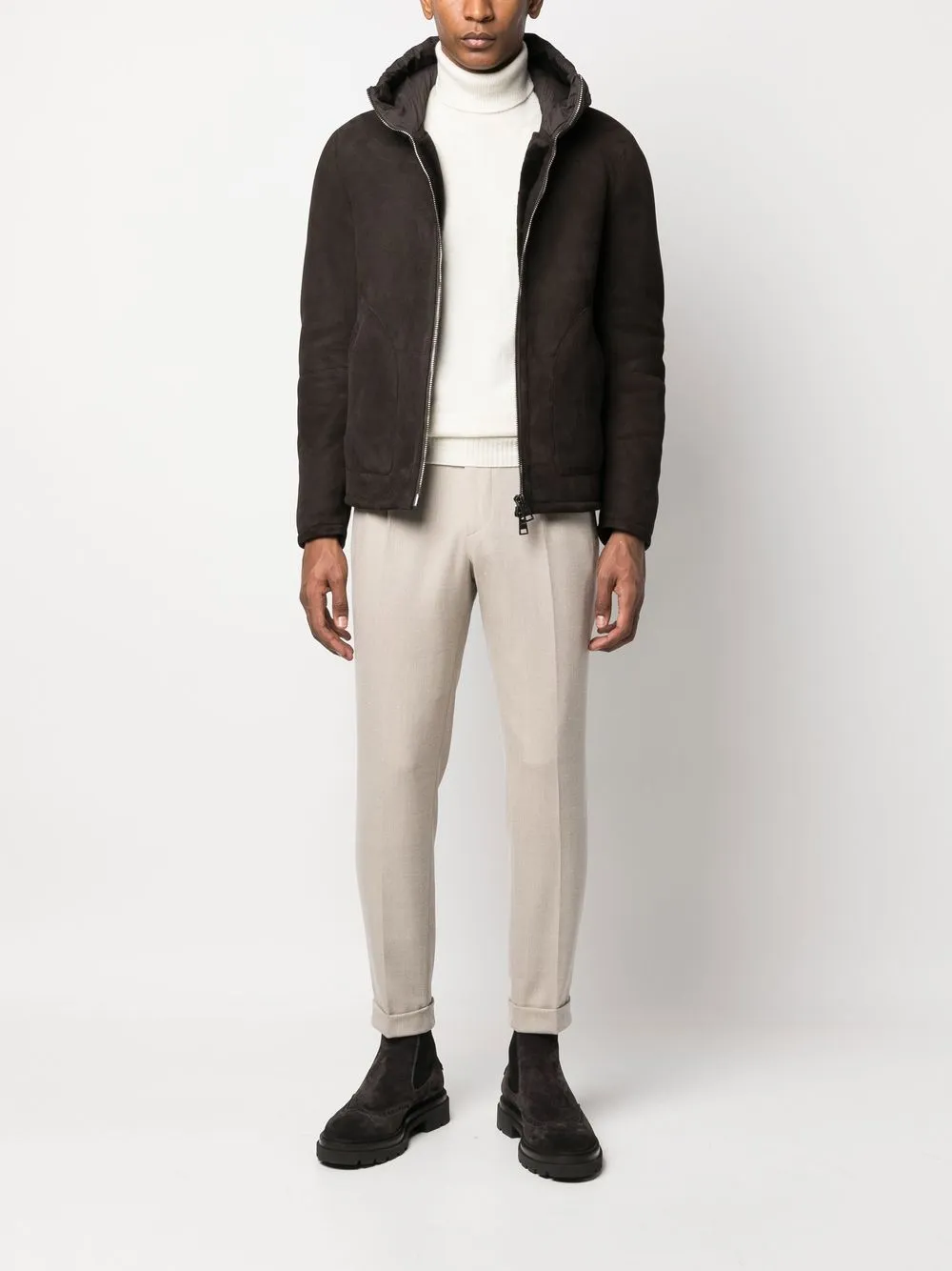 Marrón, piel de oveja, lana, plumas de ganso, forro de lana de borrego, paneles capitonados, diseño con capucha, cierre de doble sentido en la parte delantera, dos bolsillos diagonales en los laterales, manga larga y dobladillo recto.