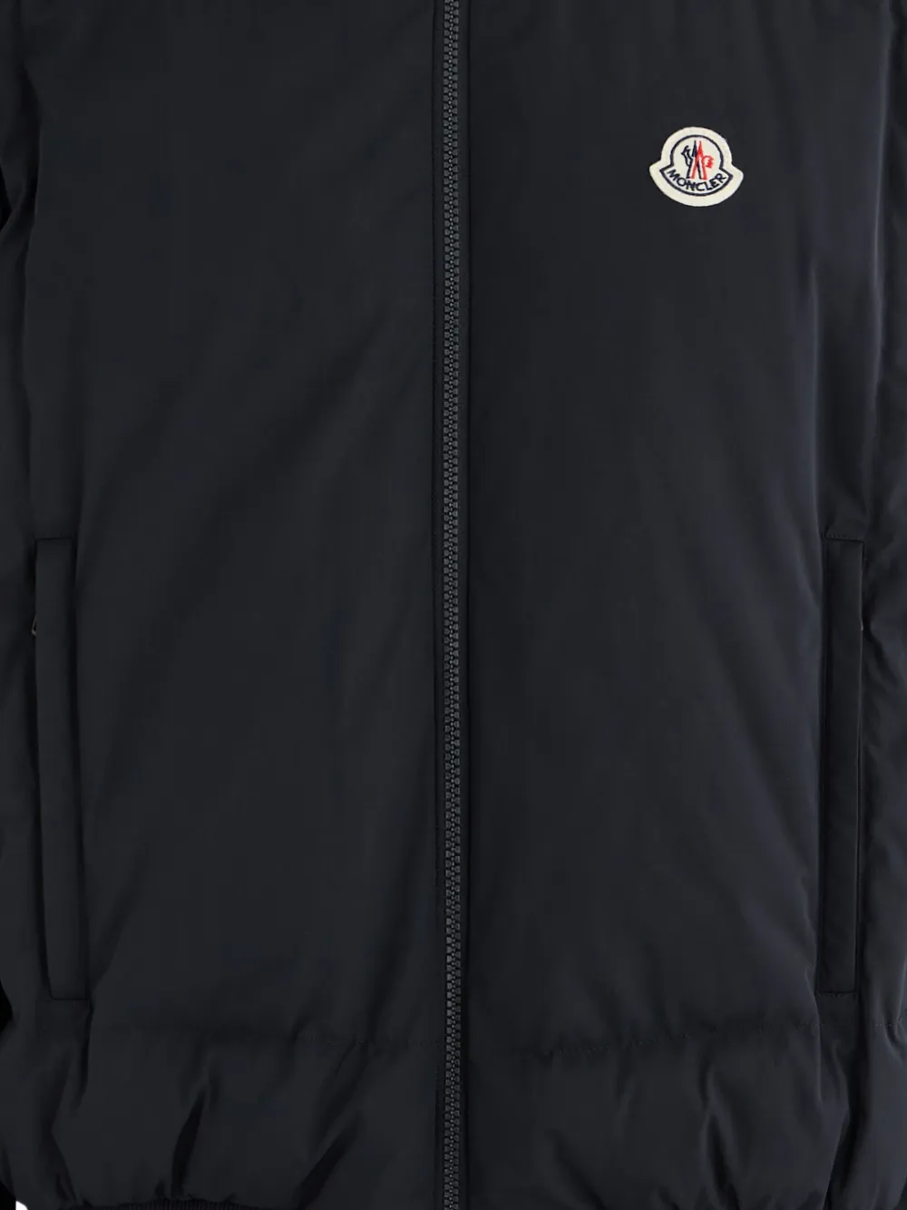dark blue logo patch ribbed hem and cuffs front zip fastening quilted stitching stand collar