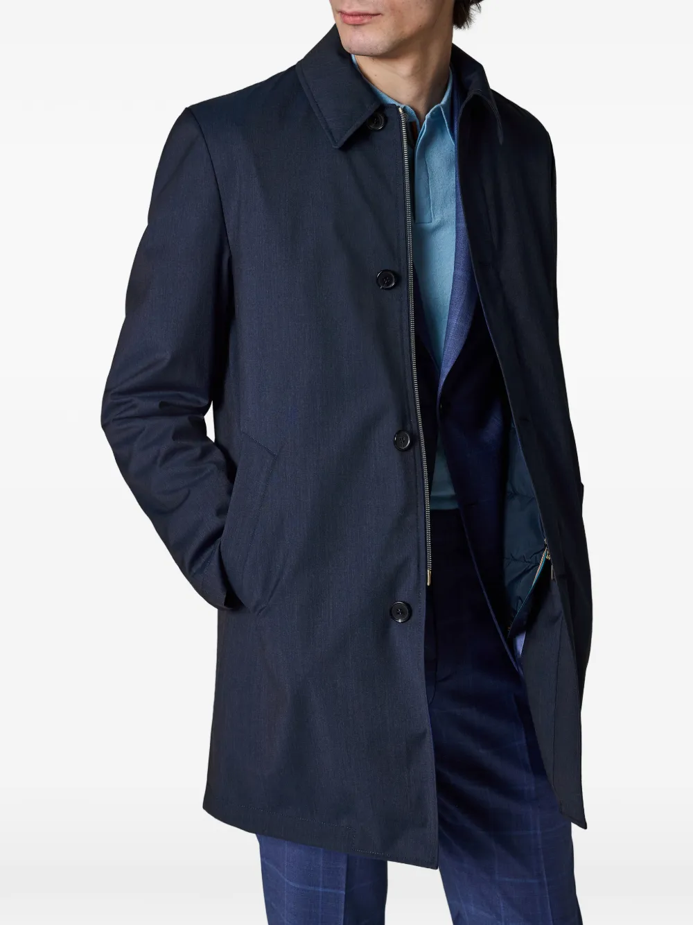 blue button fastening side welt pockets point collar