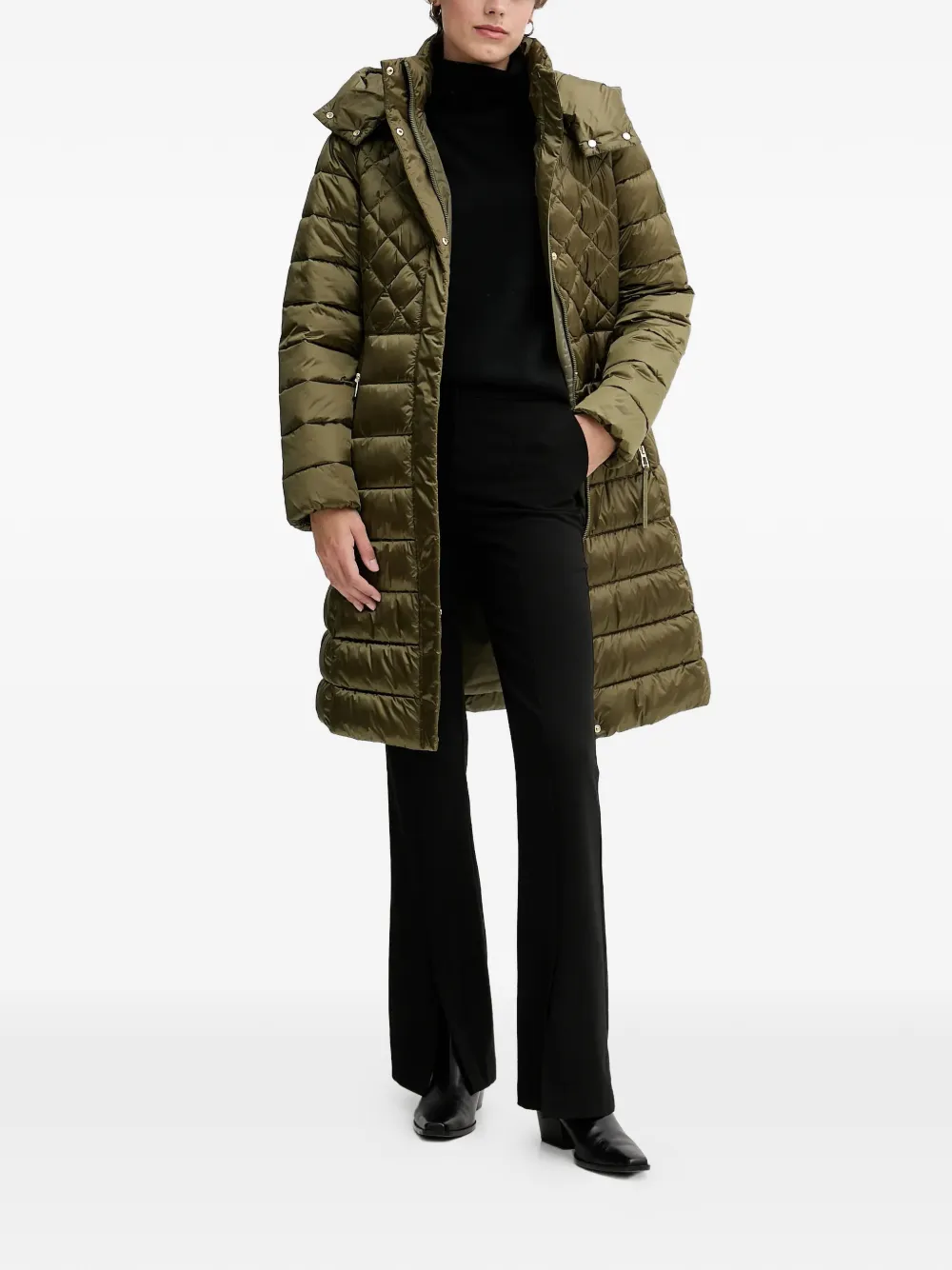 olive green quilted design hood zip fastening gold-tone hardware zip pockets