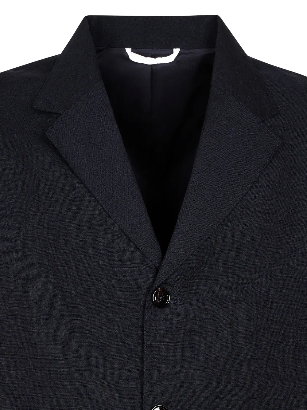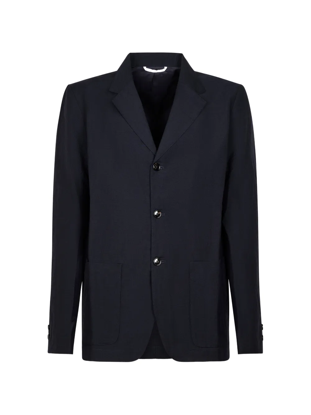 blue button fastening notched lapels front patch pockets long sleeves buttoned cuffs