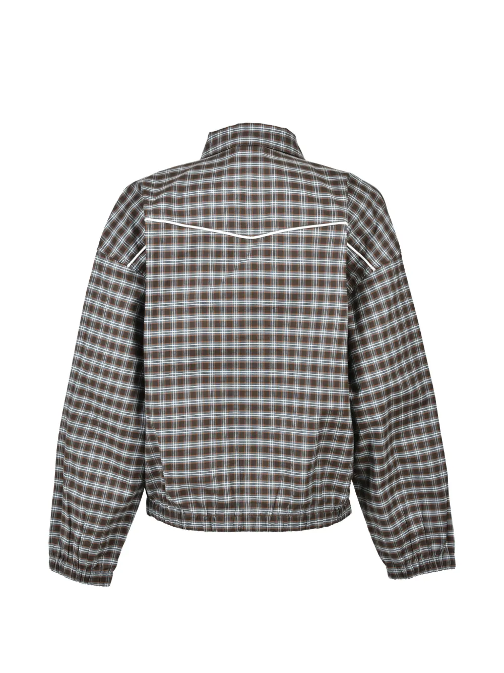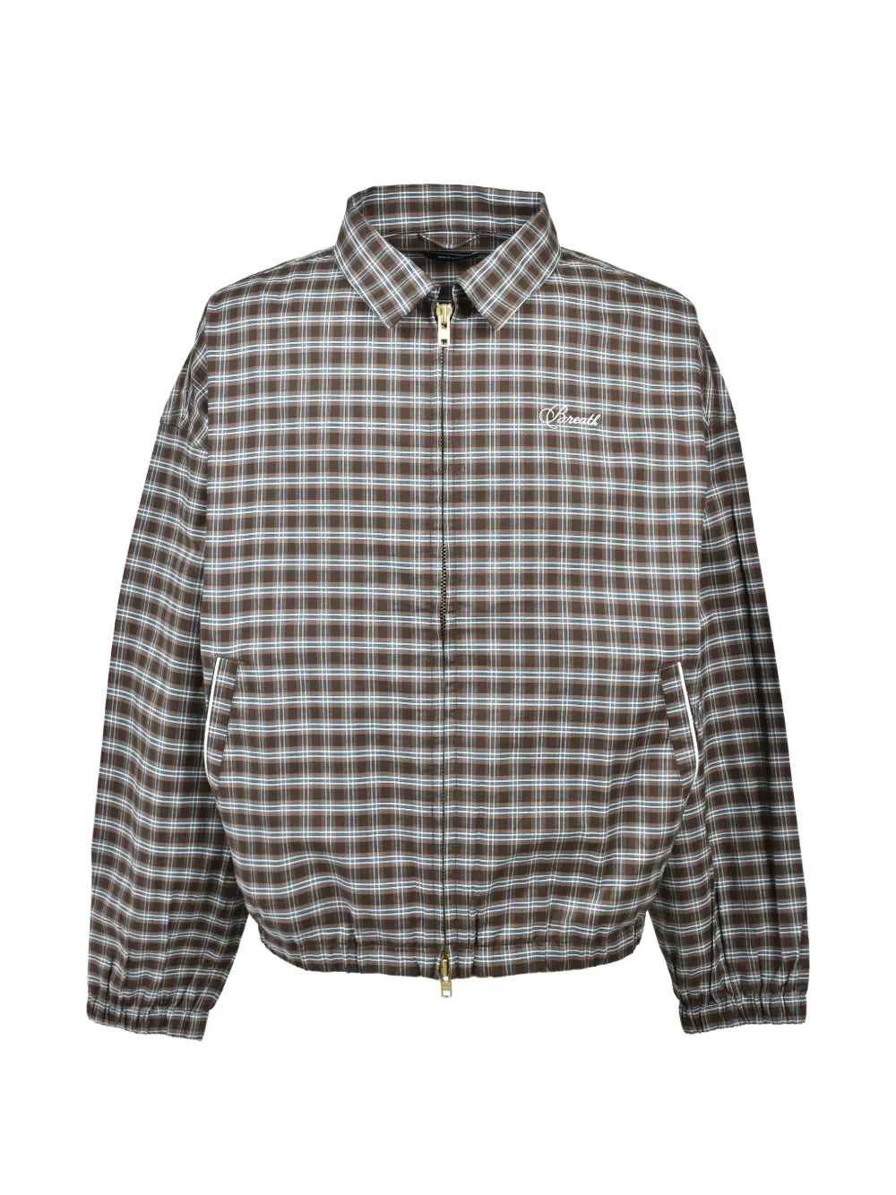 brown check pattern spread collar front zip fastening long sleeves elasticated cuffs two side welt pockets elasticated hem piping detail logo embroidery at the chest gold-tone hardware