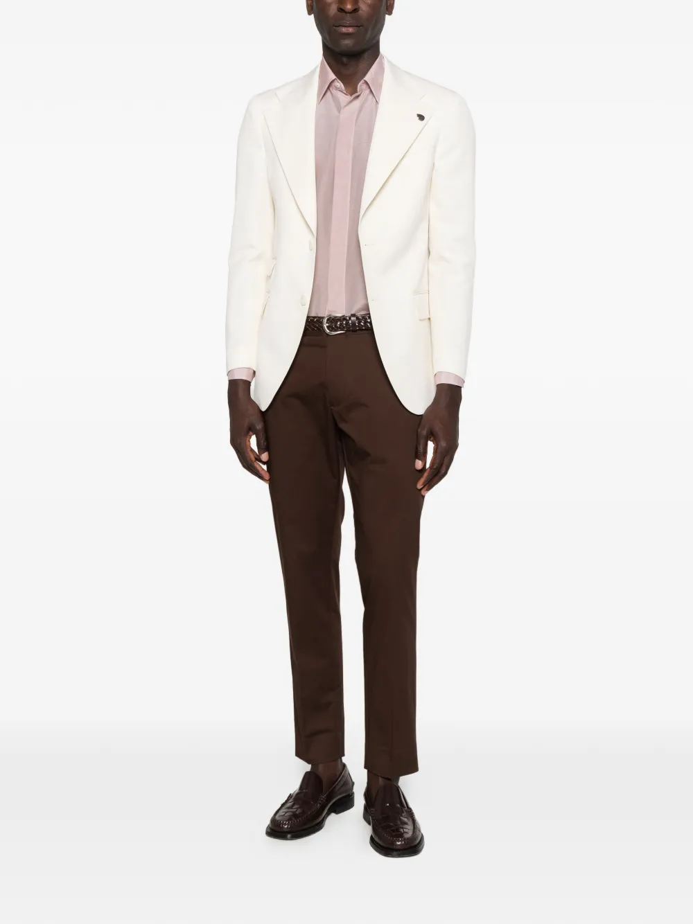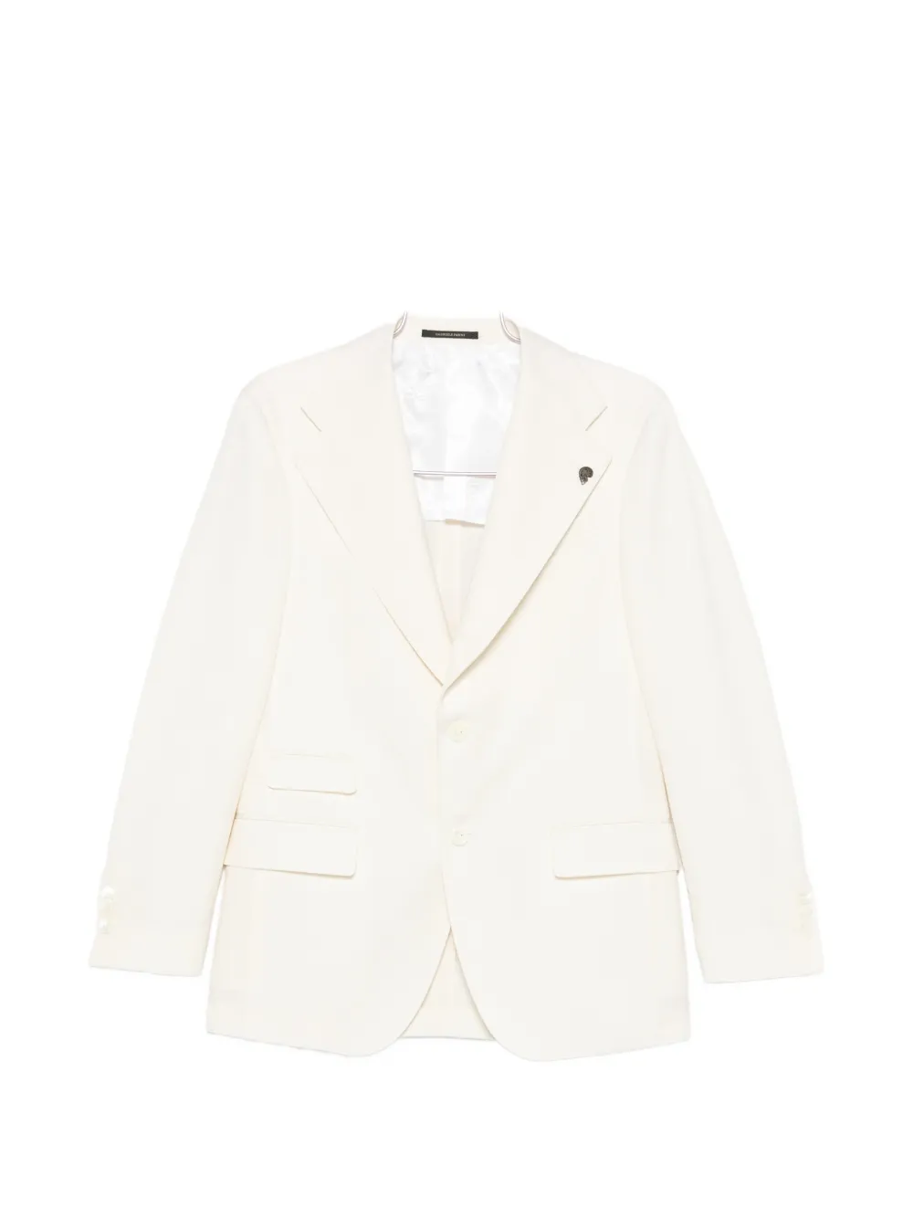 white peak lapels front button fastening ticket pocket two side flap pockets long sleeves buttoned cuffs double rear vents