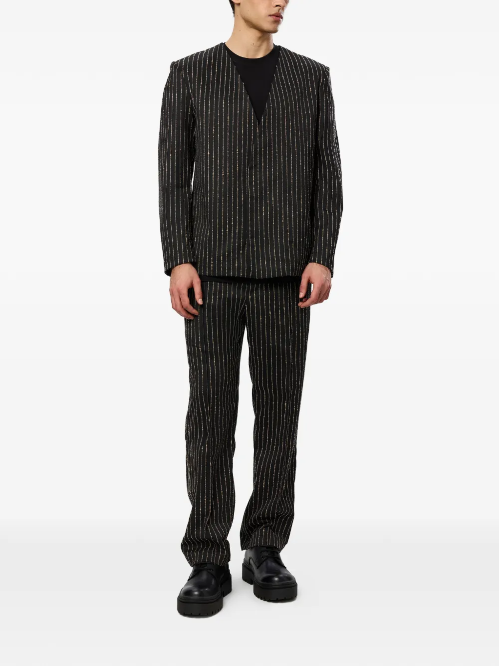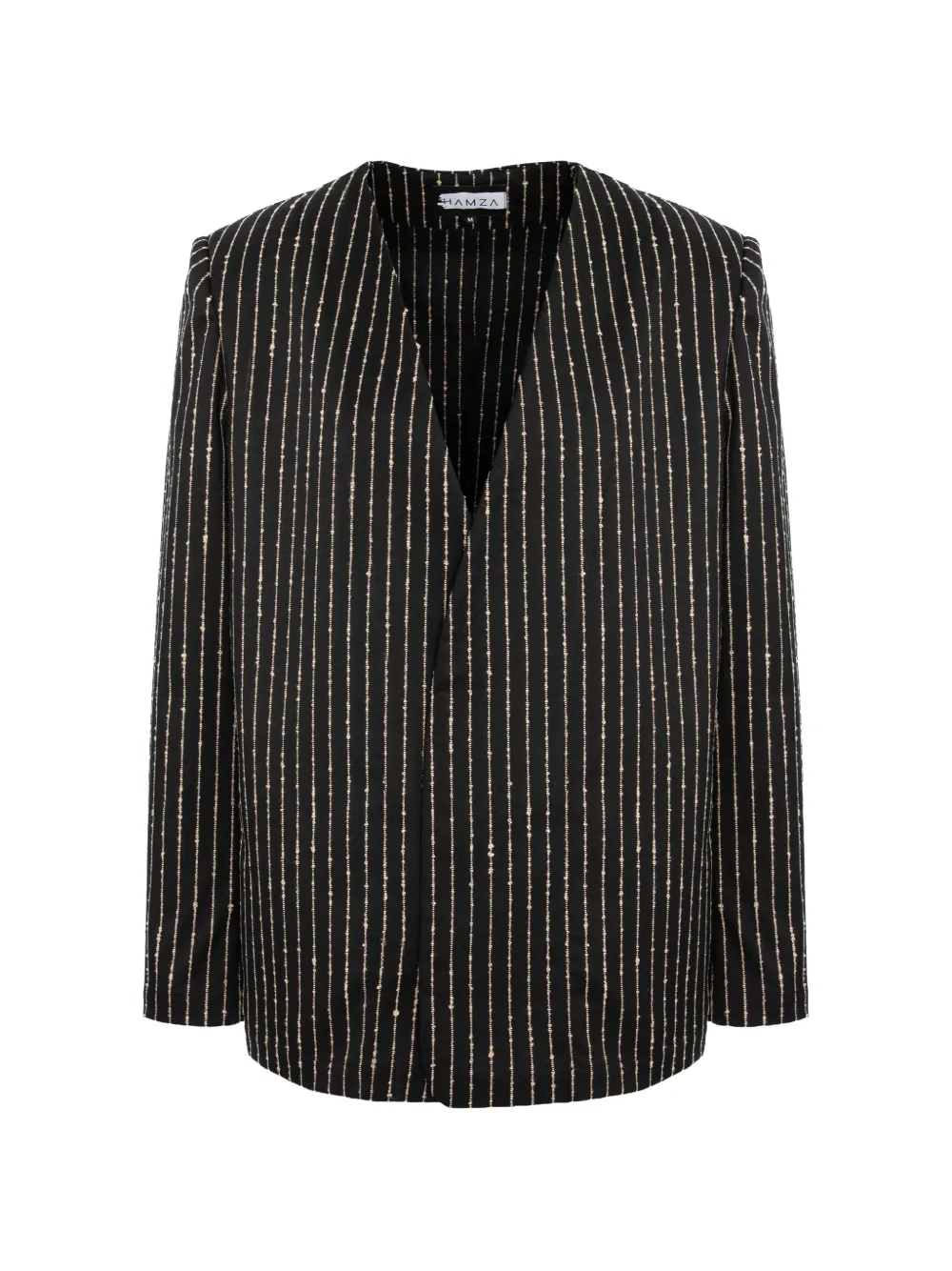 black striped pattern collarless V-neck long sleeves straight hem