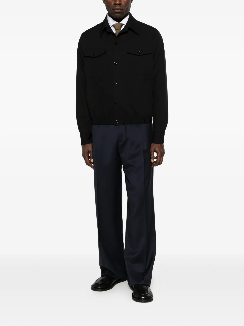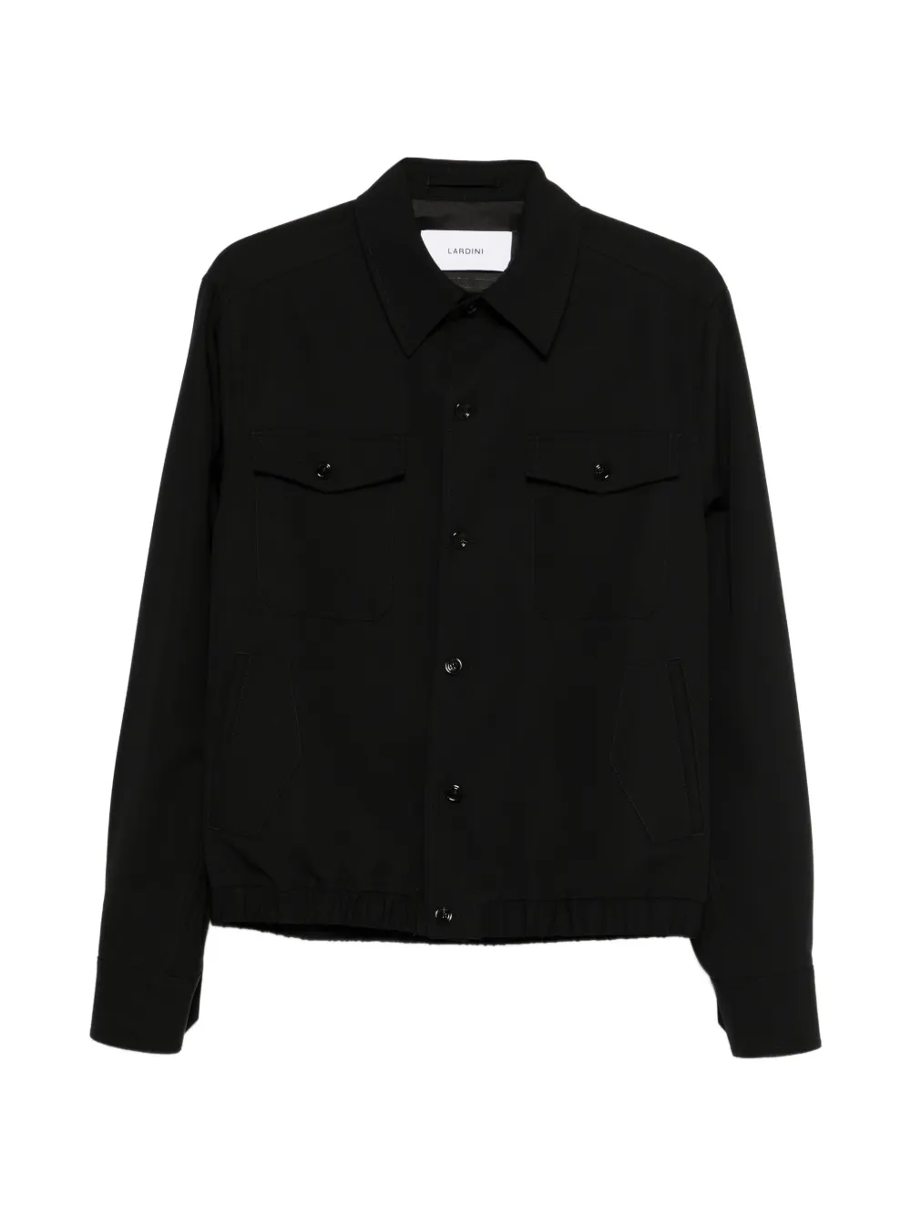 black button fastening two chest pockets elasticated hem classic collar long sleeves
