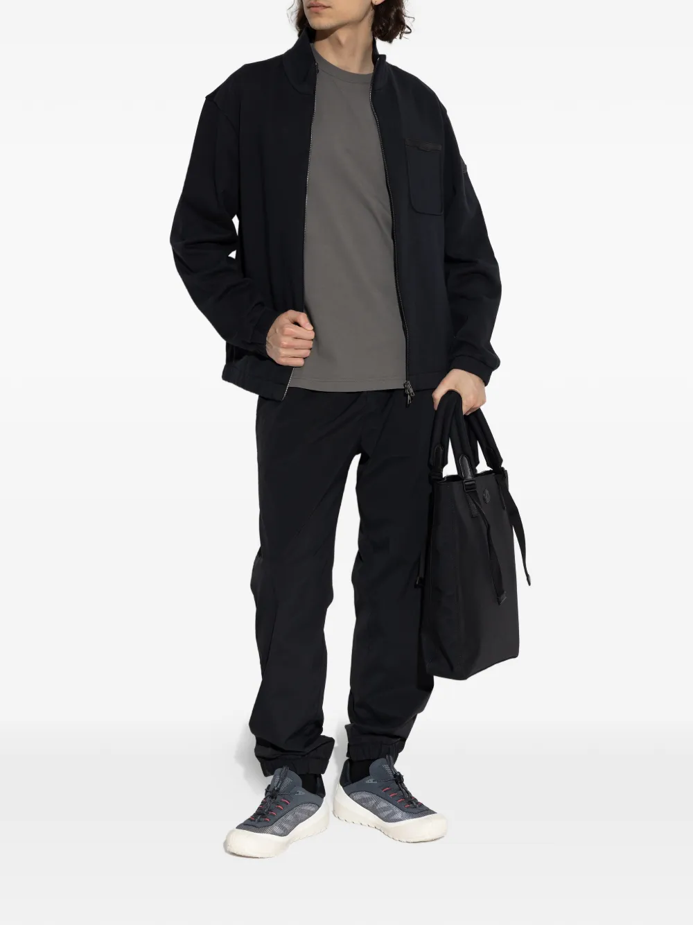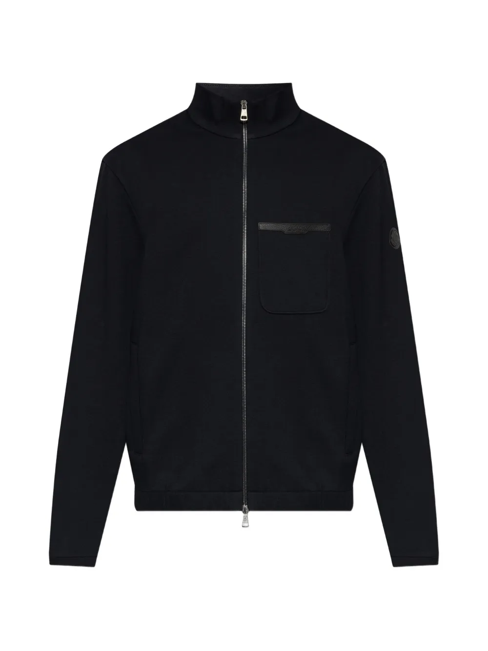 dark blue chest patch pocket front zip fastening long sleeves logo patch