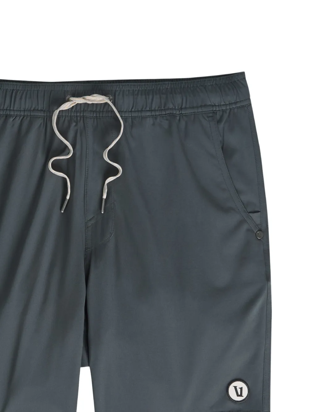 charcoal grey elasticated-drawstring waistband two side inset pockets logo patch to the front tonal topstitching straight hem