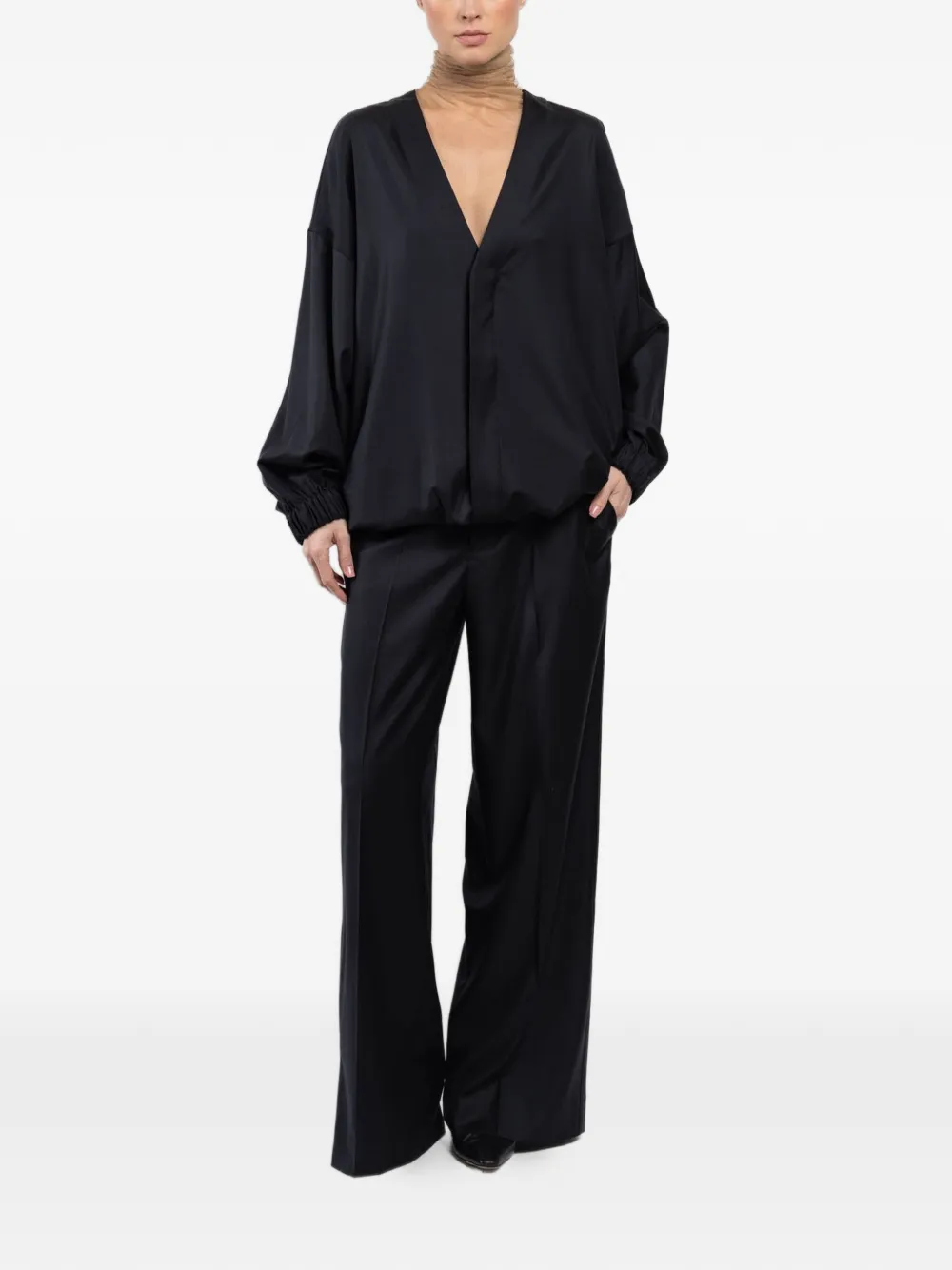 navy blue V-neck button fastening long sleeves elasticated cuffs