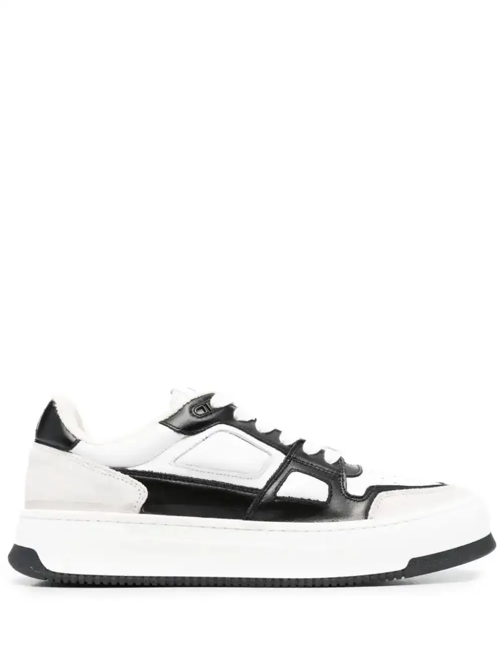 Noir/blanc, cuir de veau, logo brodé à l'arrière, modèle bicolore, bout rond, fermeture à lacer sur le devant, languette à patch logo, semelle intérieure à logo, semelle en caoutchouc.