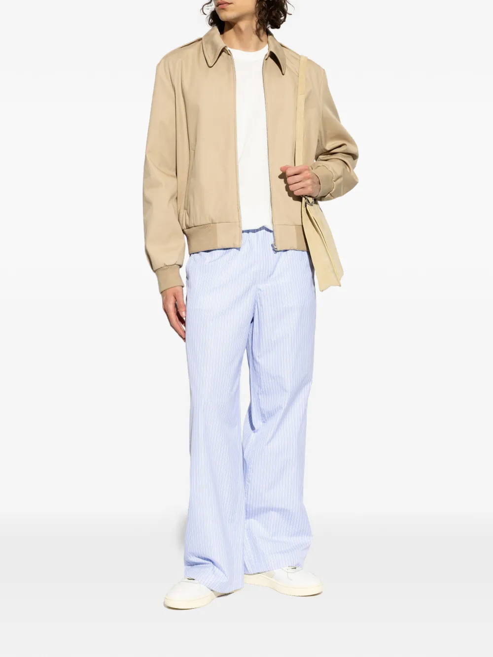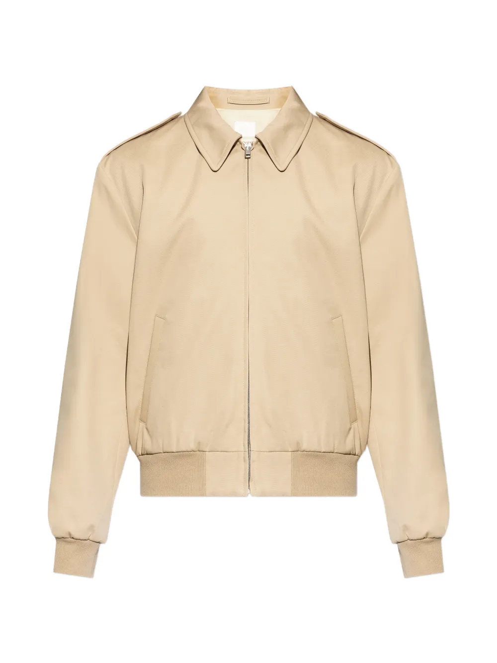 beige twill weave spread collar front zip fastening long sleeves ribbed cuffs and hem two side slit pockets silver-tone hardware