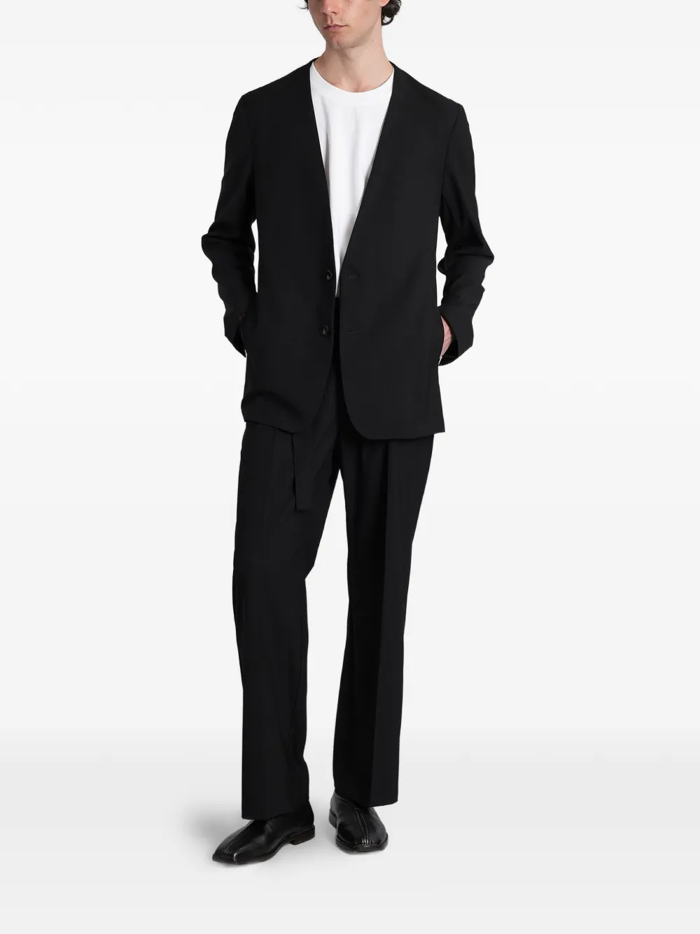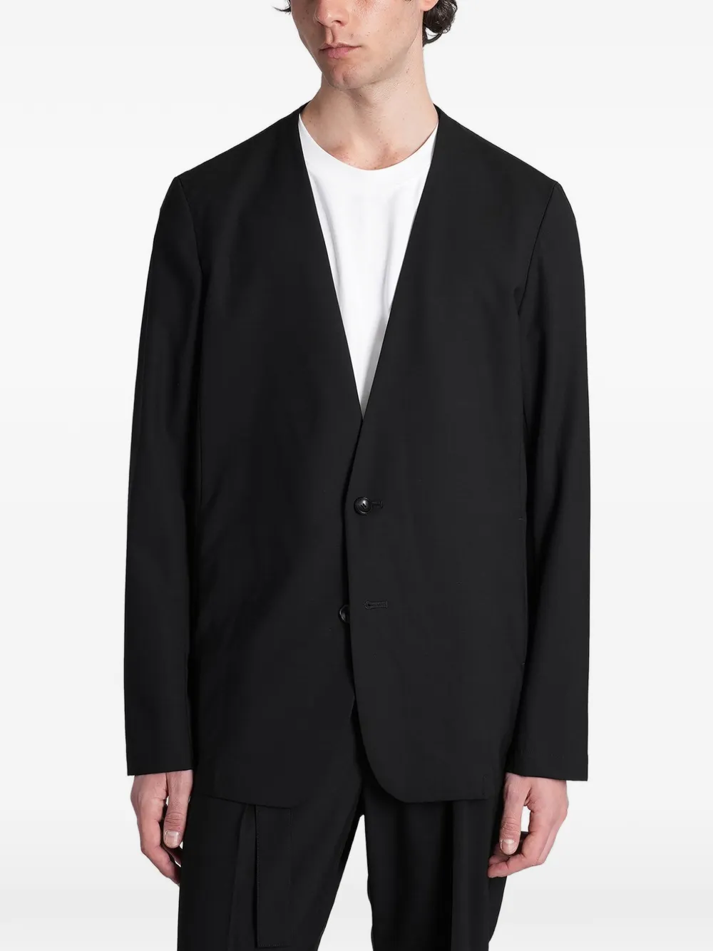 black collarless front-button fastening long sleeves buttoned cuffs two side slit pockets straight hem