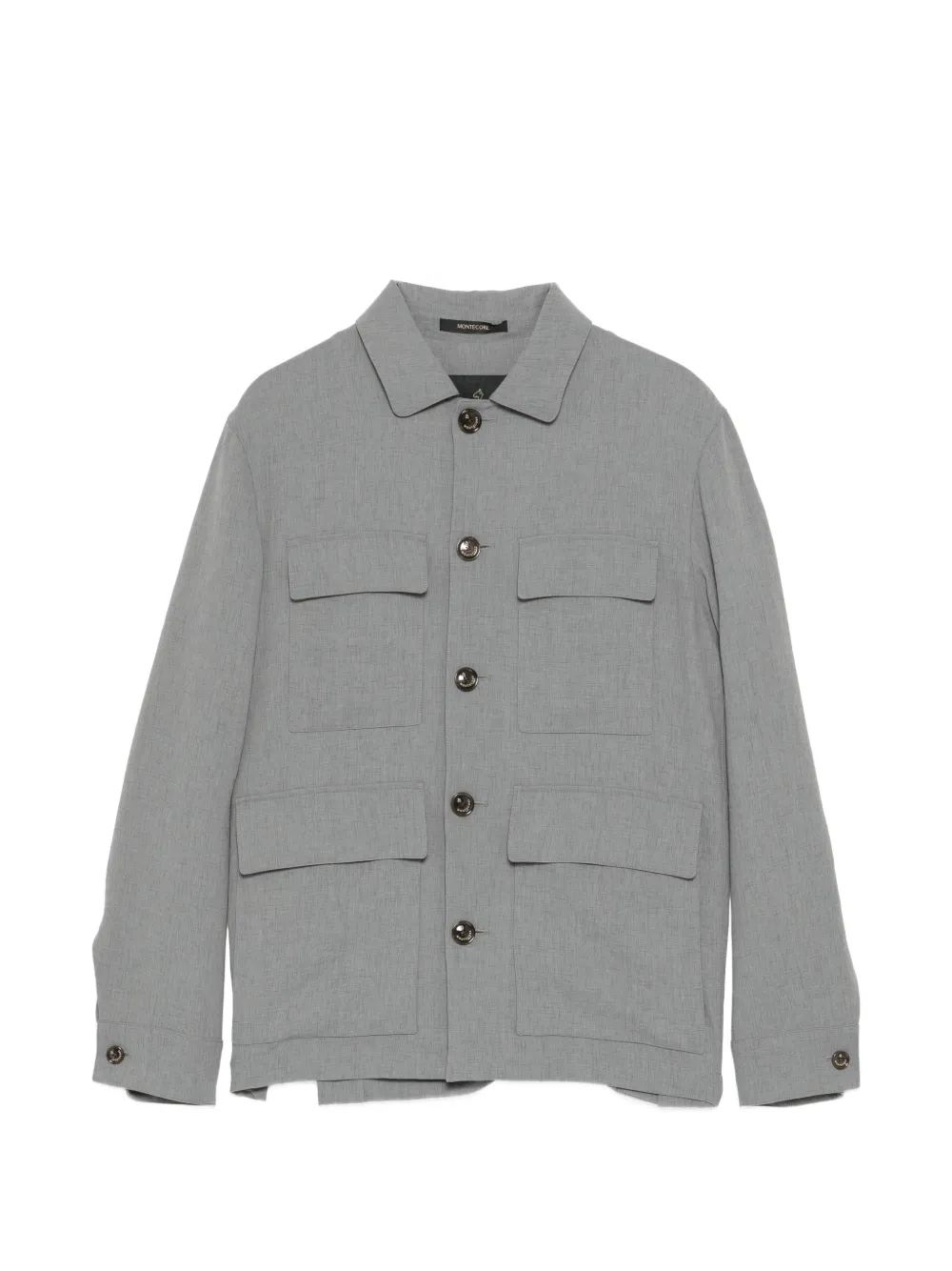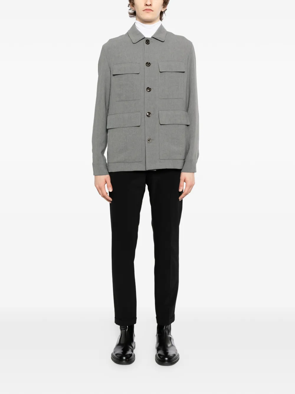 stone grey front button fastening four front flap pockets long sleeves buttoned cuffs