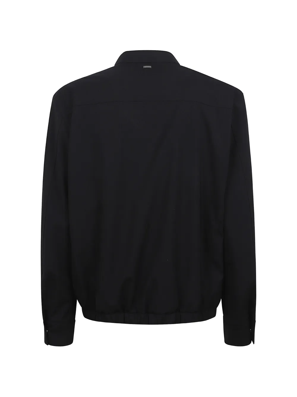 black spread collar front zip fastening long sleeves buttoned cuffs elasticated hem logo plaque to the rear