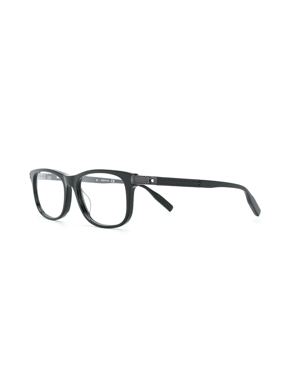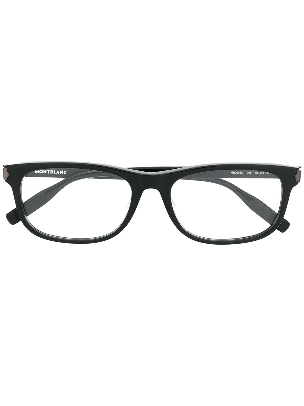 Black rectangular frame glasses from Montblanc featuring straight arms with angled tips. This item comes with a protective case. This item is unisex.