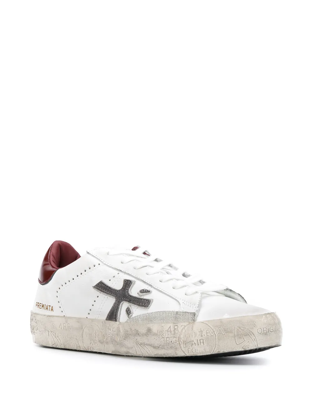 White leather Stevend low top sneakers from Premiata featuring a round toe, front and side logo branding, a lace-up front fastening, a gold-tone logo to the side, a brand embossed insole, a contrasting heel counter and a white rubber sole.