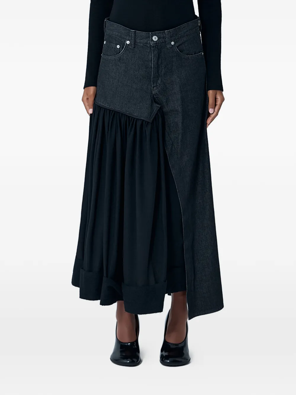 Denim midi skirt with contrast panels.Mid riseTop-button and zip-fly fasteningBelt loopsFive pocketContrast panels
