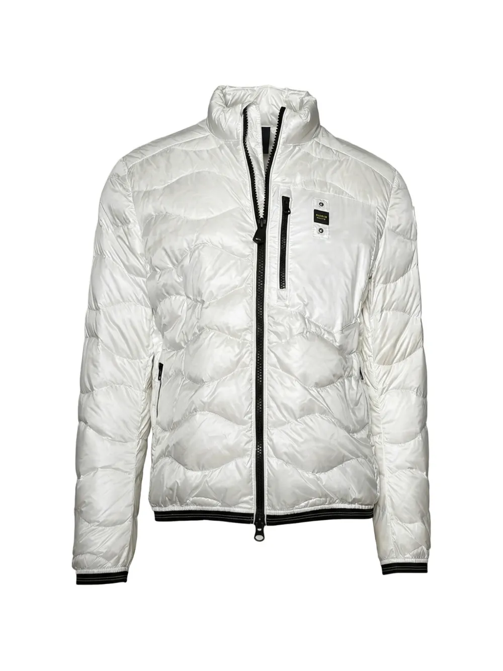 white quilted zip fastening logo patch high neck ribbed hem and cuffs