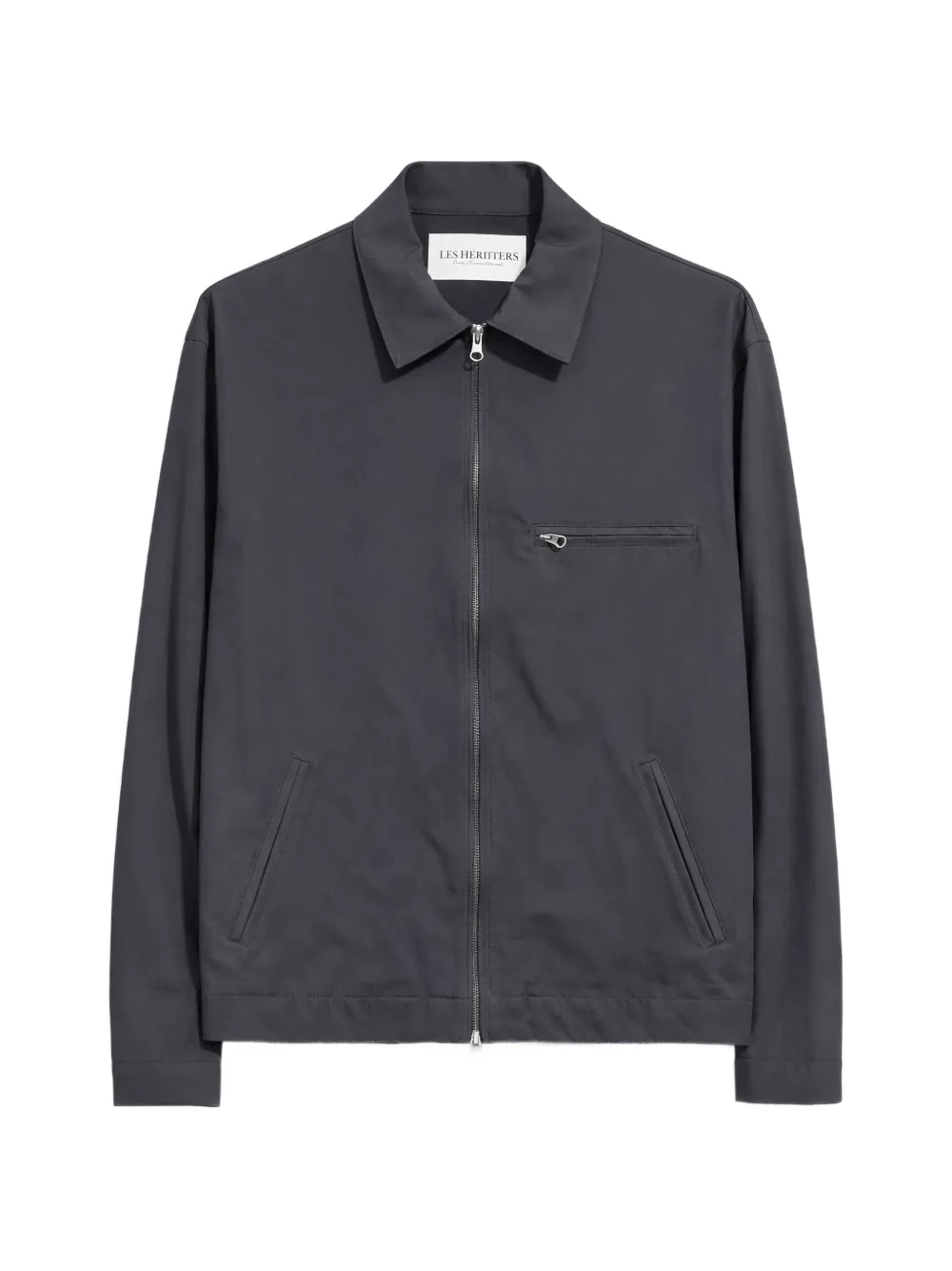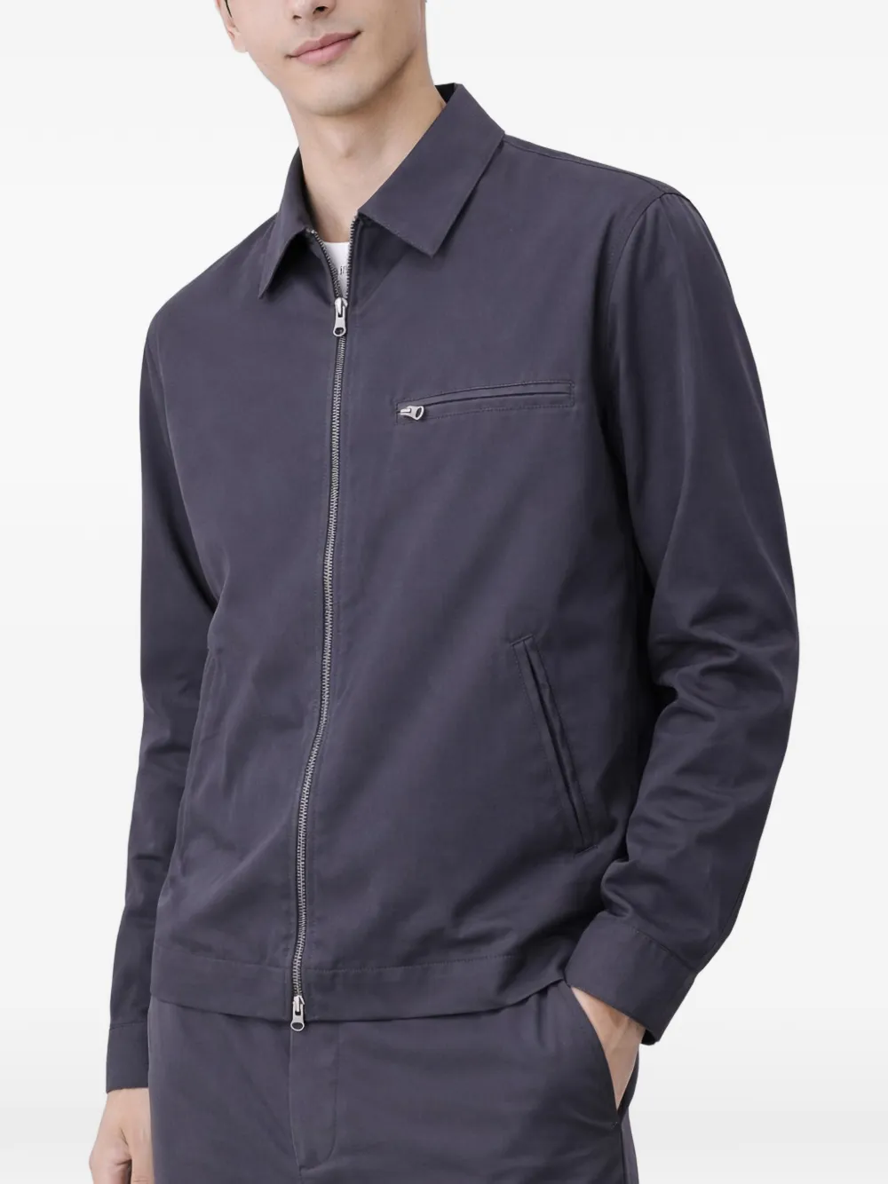 blue spread collar front zip fastening zip-fastening chest pocket two side welt pockets long sleeves buttoned cuffs straight hem