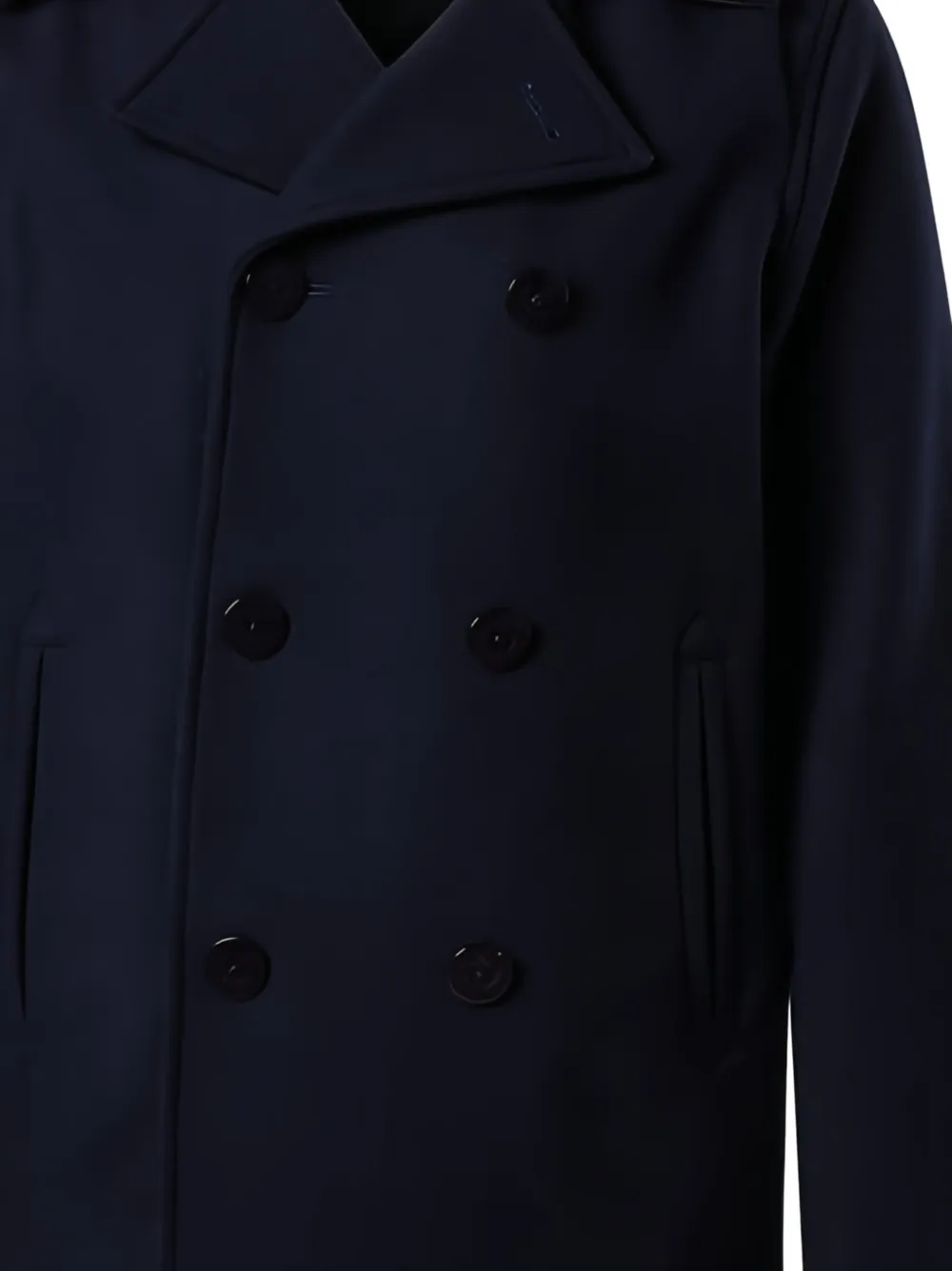 dark blue double-breasted button fastening wide lapel welt pockets