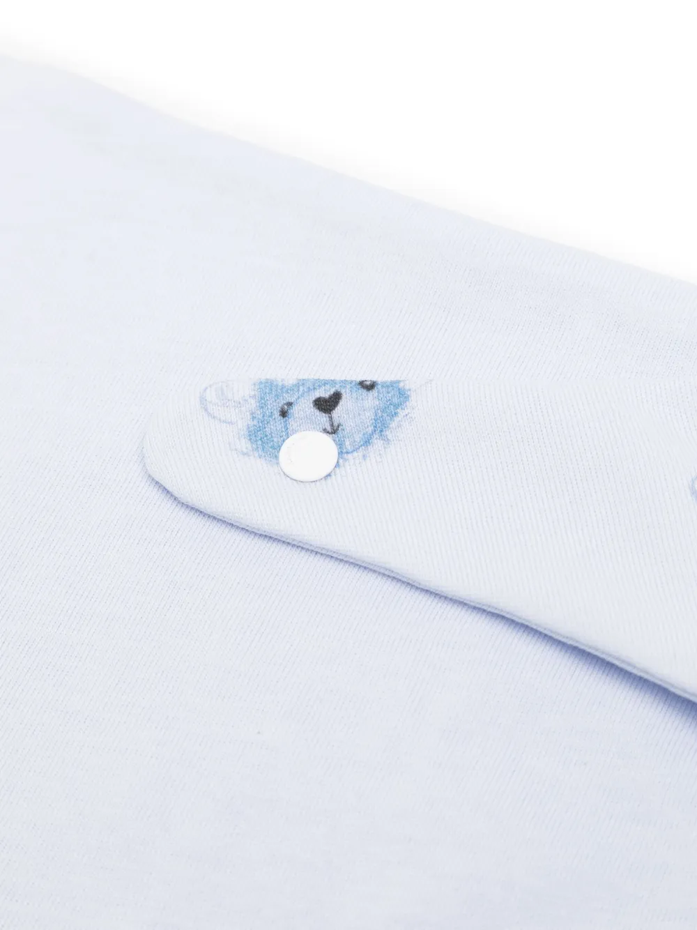 ライトブルー、ホワイト、コットン、テディベアモチーフ、フロントにロゴプリント、ラウンドネック、バックにスナップボタン留め、ロングスリーブ、ストレートな裾、ロゴプリント、ゴムウエスト、アンクル丈、ジオメトリックシェイプ、ロゴプリント。