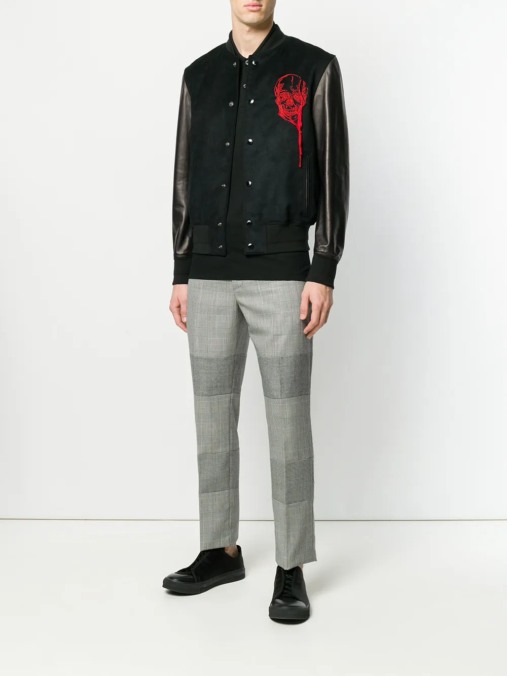 Alexander McQueen(アレキサンダー・マックイーン)の、スタジアム ジャケット(ブラック)。リブ編みの襟、スナップボタン留め、パネル切替え長袖、リブ編みの裾とカフス、刺繍のディテール、レザーのディテール。