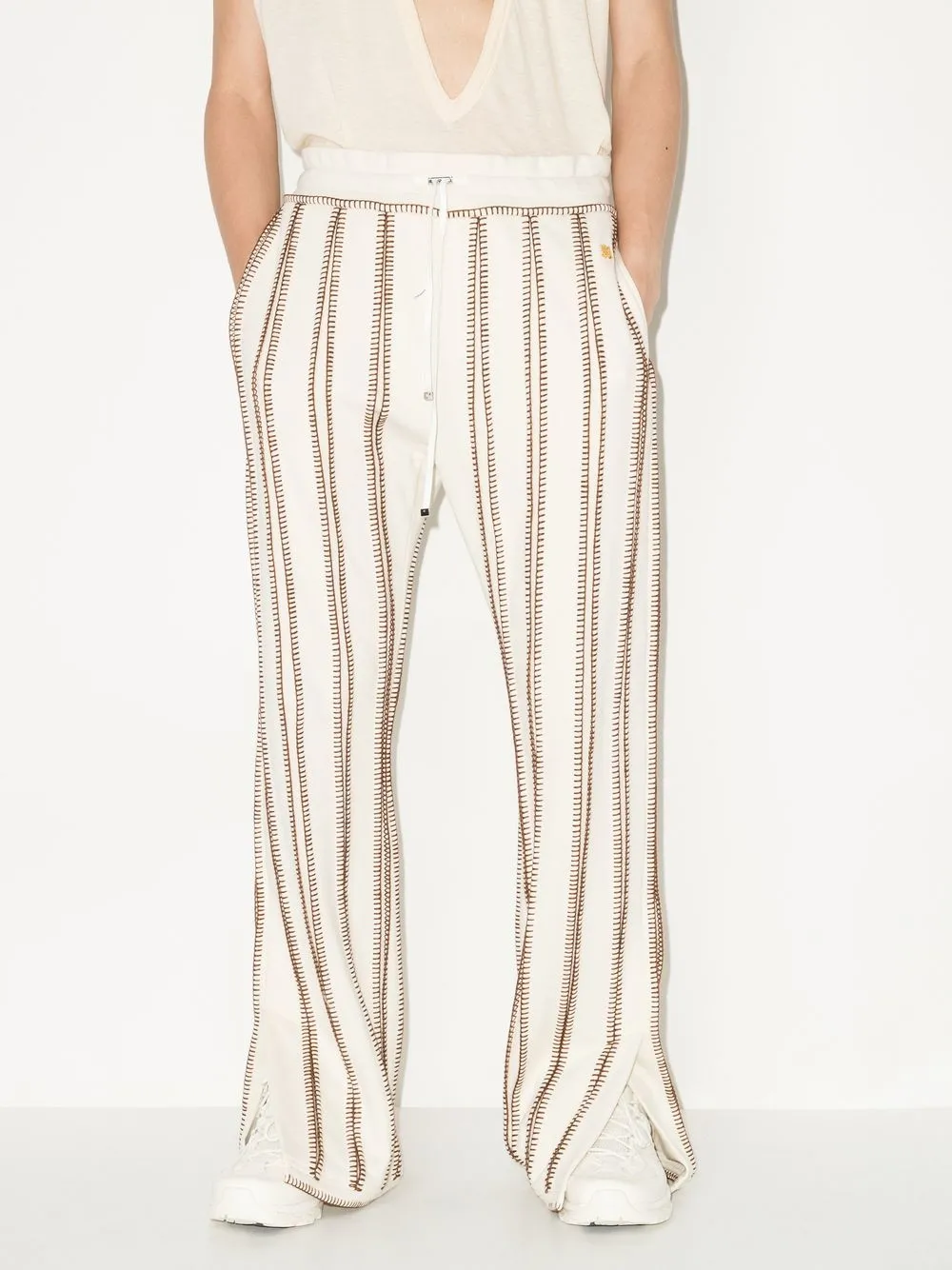 オフホワイト、コットン&ウールブレンド、ゴールドトーンのロゴプレート、バックにロゴパッチ、コントラストステッチ、バーティカルストライプ、ドローストリングゴムウエストバンド、サイドにスリップポケット、スリットヘム。