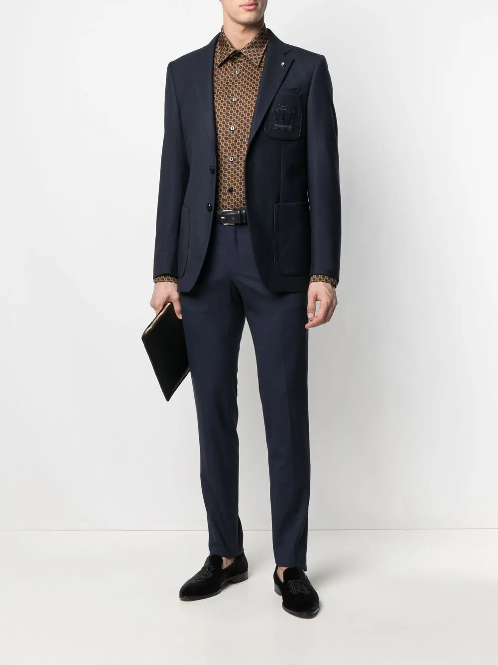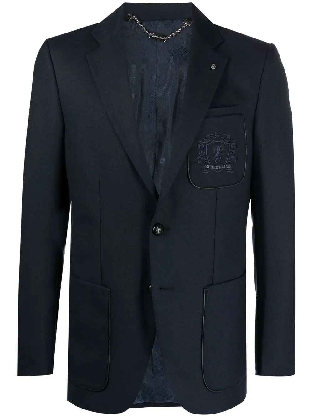 クレストモチーフ、ダーツディテール、フロントにパッチポケット、サイドにパッチポケット x 2、ノッチドラペル、フロントにボタンクロージャー、ロングスリーブ、センターベント。