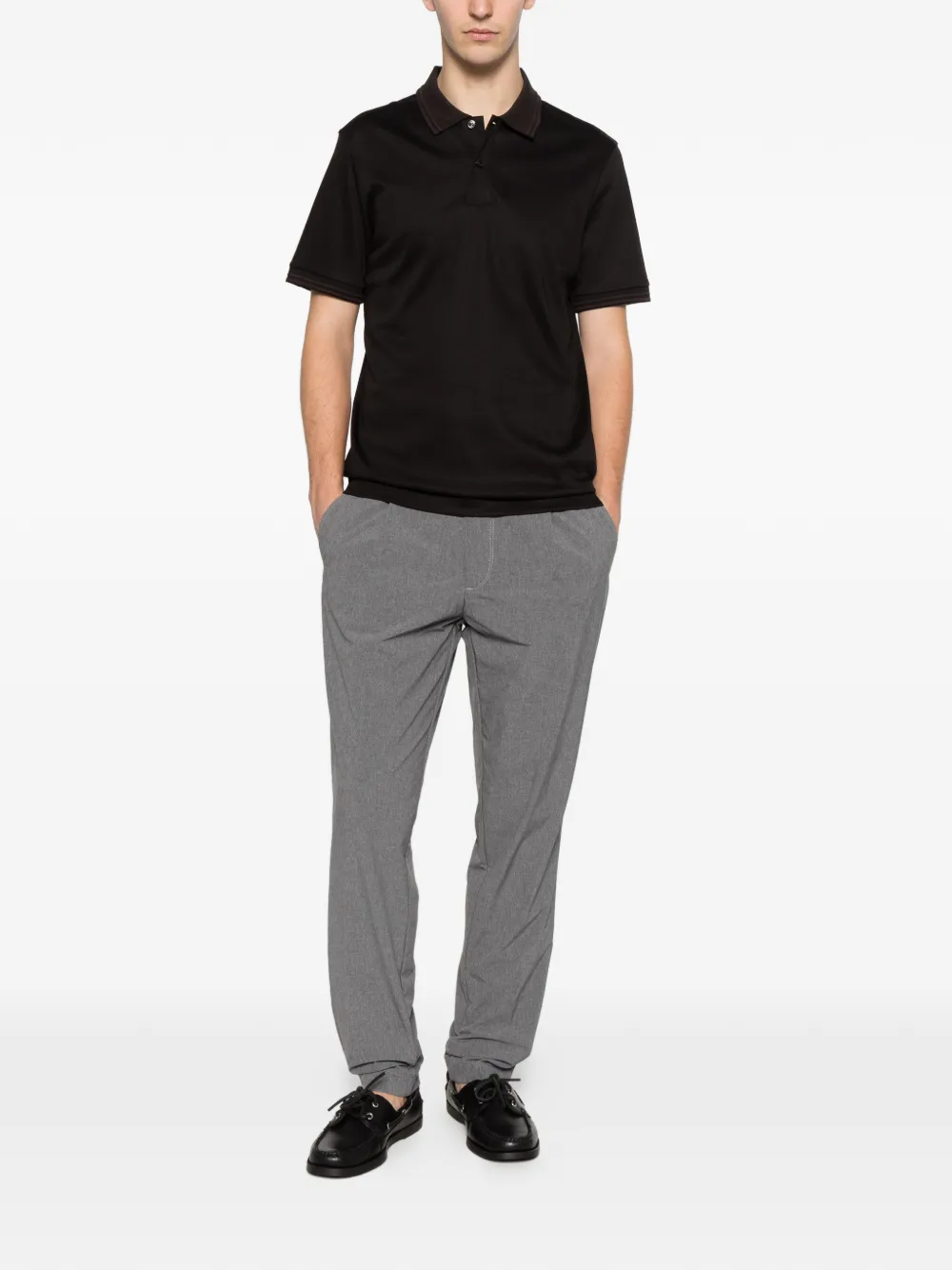 black cotton polo collar front button placket short sleeves ribbed cuffs straight hem