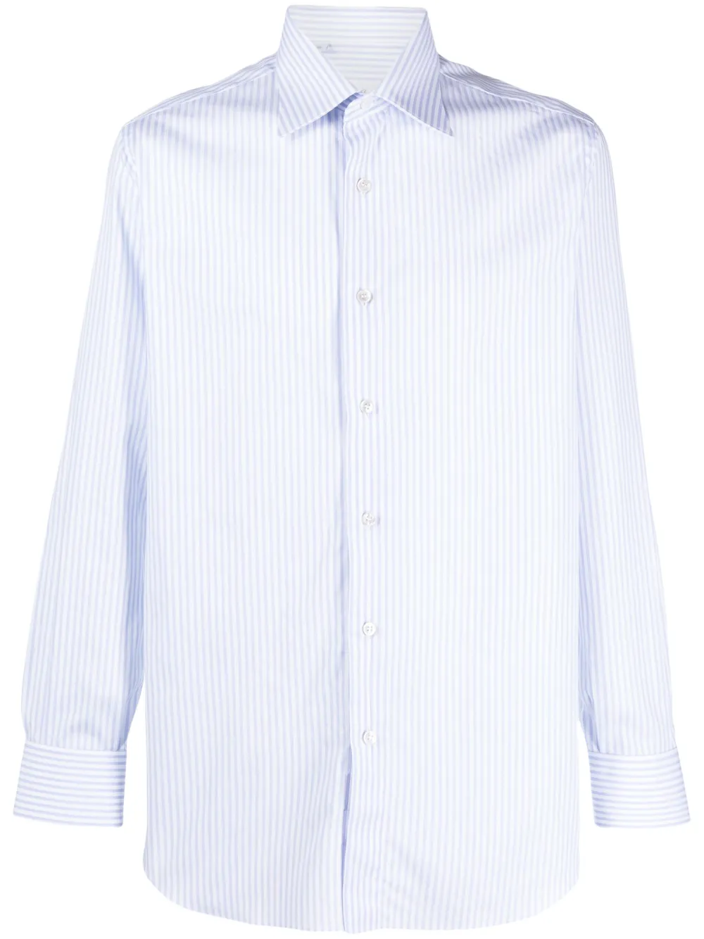 コットン、パウダーブルー、コットン、バーティカルストライプ、ポインテッドフラットカラー、フロントにボタン留め、ボタン付きカフス、カーブドヘム。