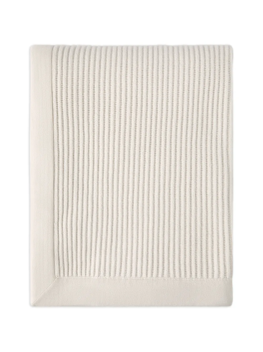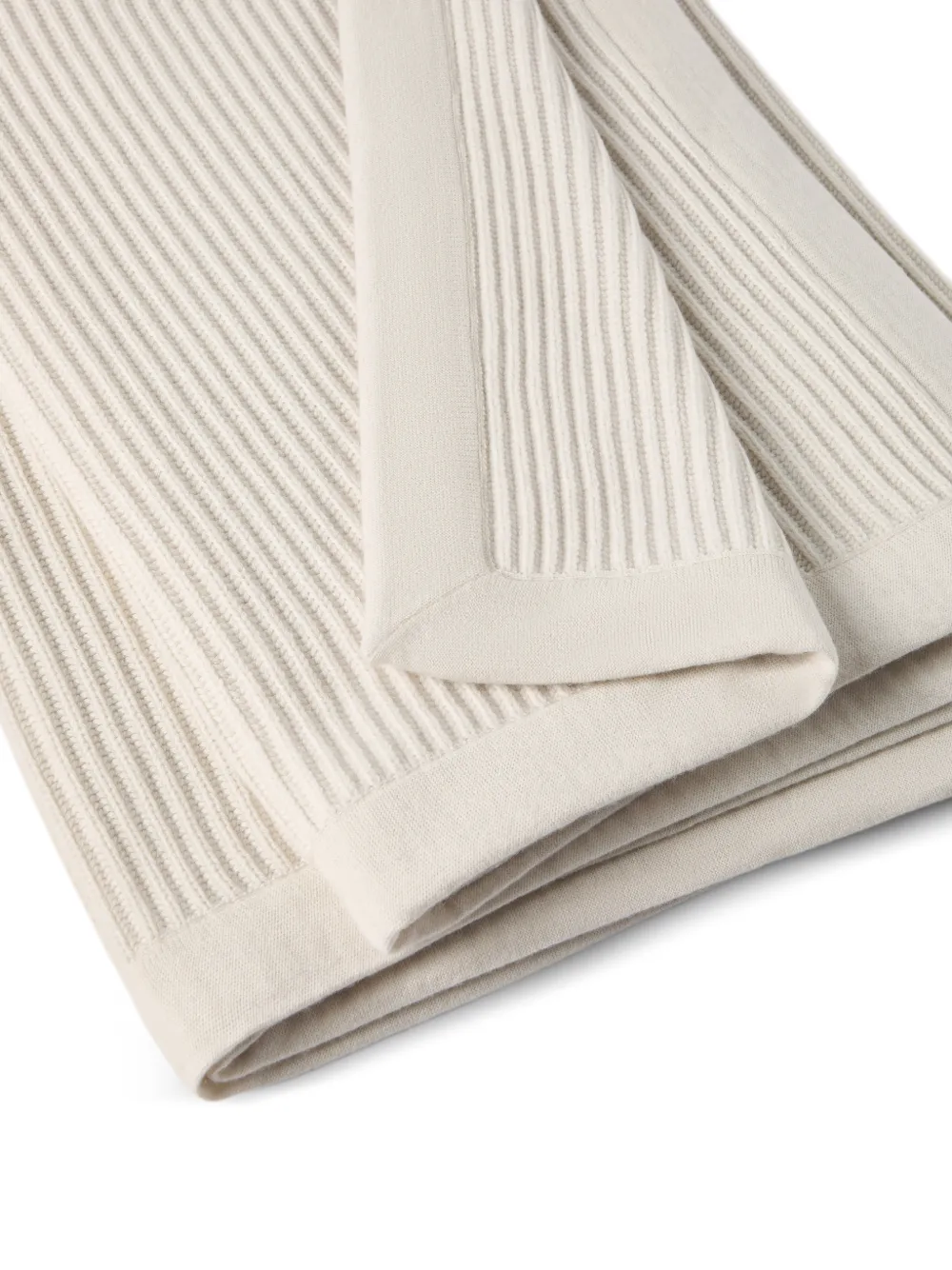 Brunello Cucinelliの洗練された糸が生み出す、ピュアカシミアブランケット。ブランドを象徴するアイコニックなヤーンを用いたこの仕立ては、クラシックなハーフフィッシャーマンズリブ(片あぜ編み)と、エッジ部分の滑らかな天竺編みを組み合わせることで、繊細な質感のコントラストを生み出しています。