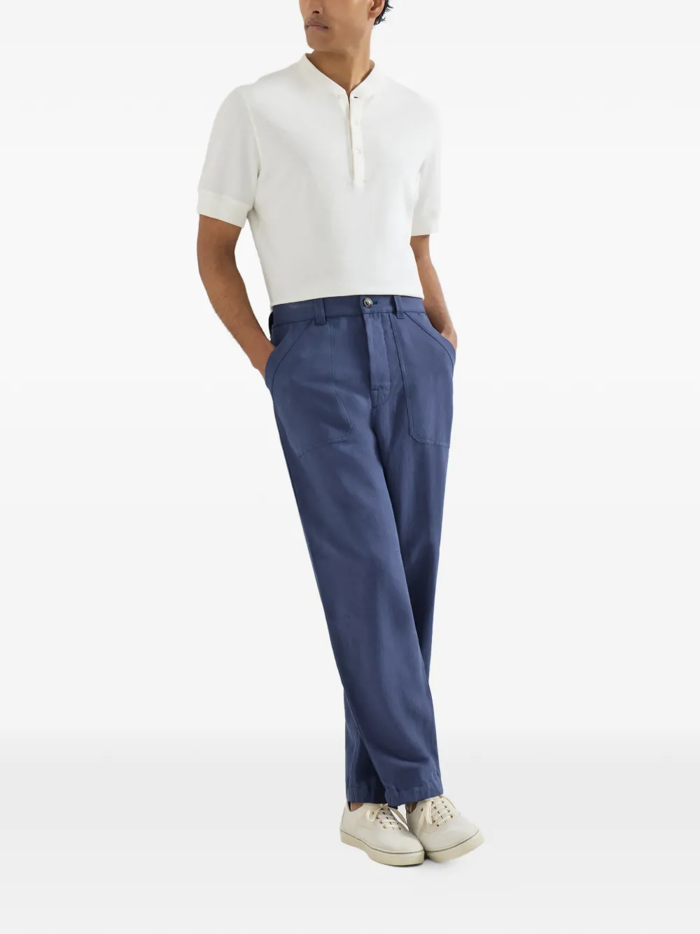 上質な素材とスポーツウェアからインスピレーションを得たディテールの絶妙なバランスがコンテンポラリーなスピリットを表現する、リラックスフィットのコットン&リネンドリルパンツ。ヒップから脚に沿って快適に流れる、ワイドなラインを持つ柔らかなプロポーションです。パッチポケット、ドローストリングウエスト、調節可能なグログランの袖口といった機能的な要素が、インフォーマルなデザインを引き立てます。
