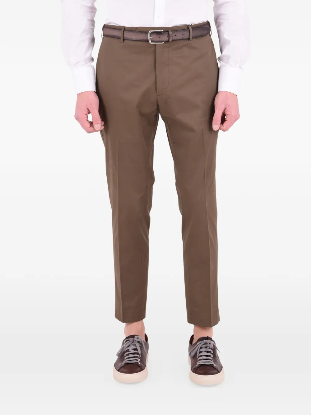 Dell'oglio(デッローリオ )の、クロップド パンツ(カーキグリーン)。前面にコンシールタイプの留め具、ベルトループ、サイドポケット、背面にフラップ付きポケット。