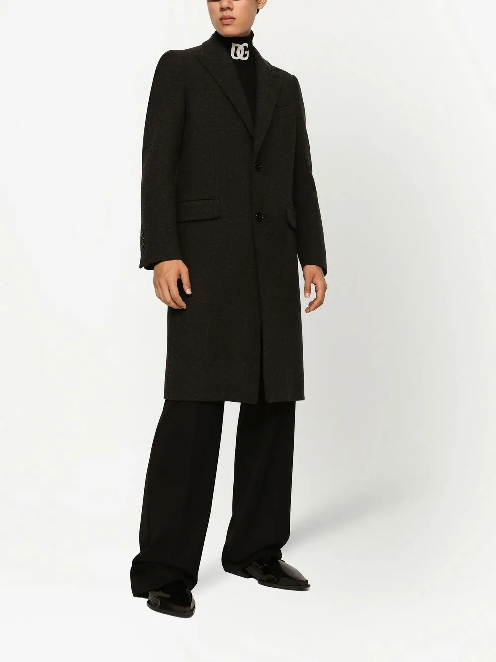 ブラック、シルク、ウールブレンド、ピークドラペル、フロントにボタン留め、ロングスリーブ、胸元にウェルトポケット、フロントにフラップポケット x 2、ミドル丈、センターベント、総裏地。