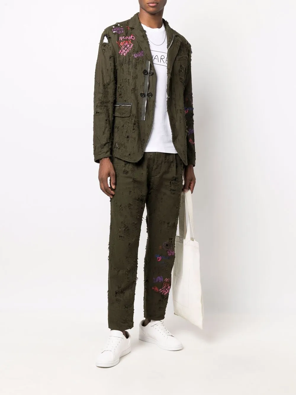 グラフィティプリント、ダメージ加工、ベルトループ、サイドにスラッシュポケット x 2、バックにウェルトポケット x 2、クロップドスタイル。