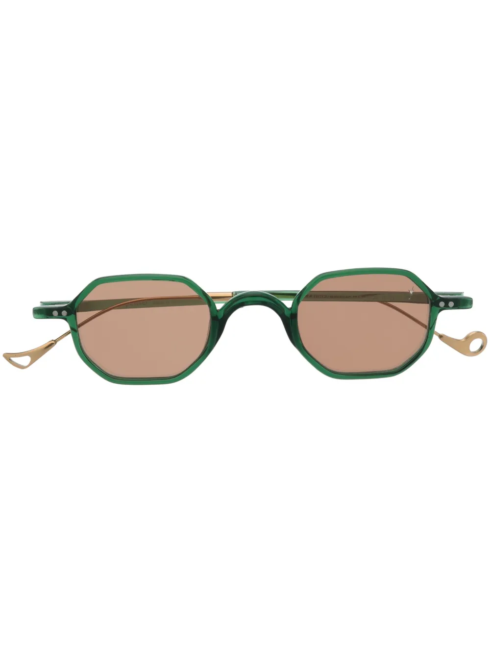 グリーン、ゴールドトーン、ジオメトリックフレーム、ブラウンティントレンズ、ストレートテンプル、カーブエンド。こちらの商品には保護ケースが付属しています。