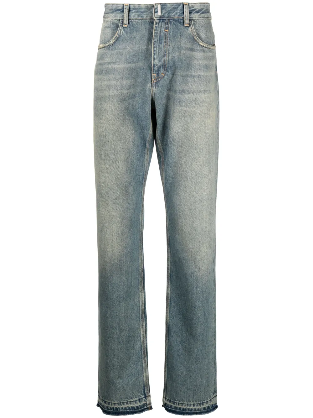 ブルー、コットン、ストーンウォッシュ加工、ストレートレッグ、ベルトループ、フロントにコンシールタイプの留め具、バックにパッチポケット x 2。