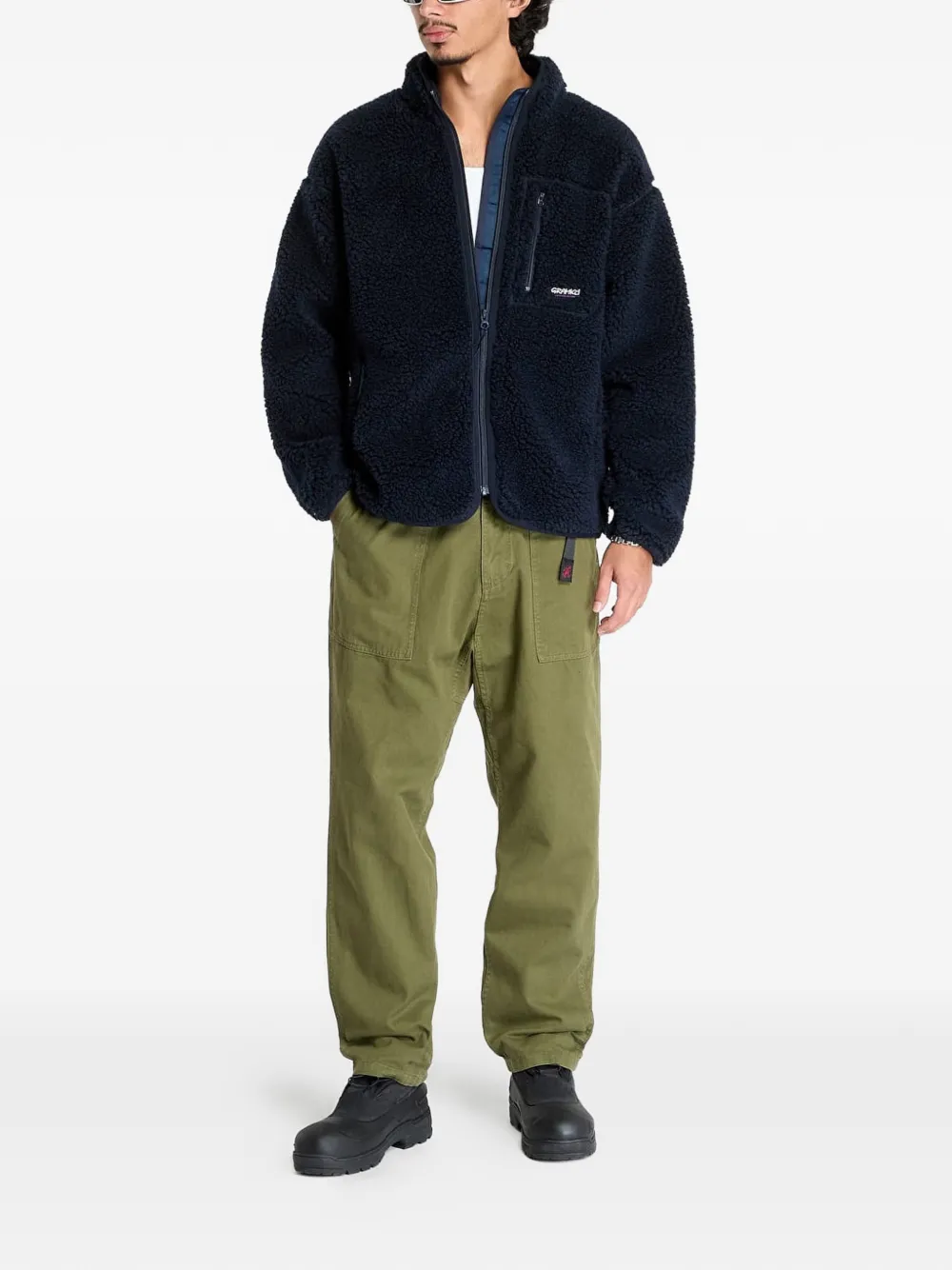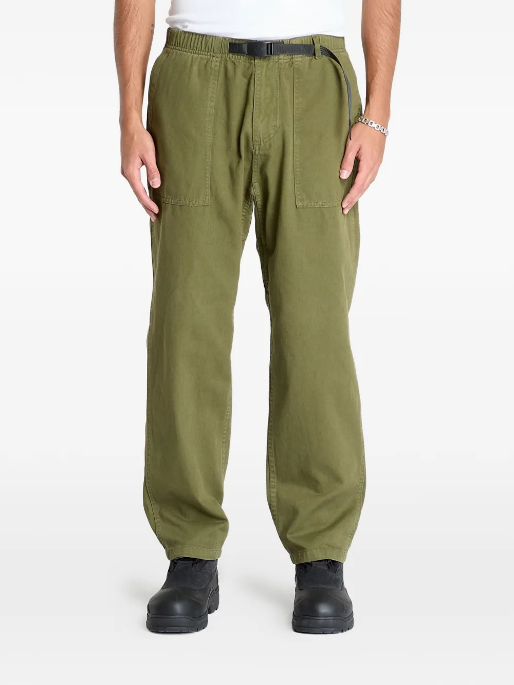 オリーブグリーン、コットン、テーパードレッグ、ベルテッドスタイル、ゴムウエスト、フロントにパッチポケット x 2、バックにパッチポケット x 2。