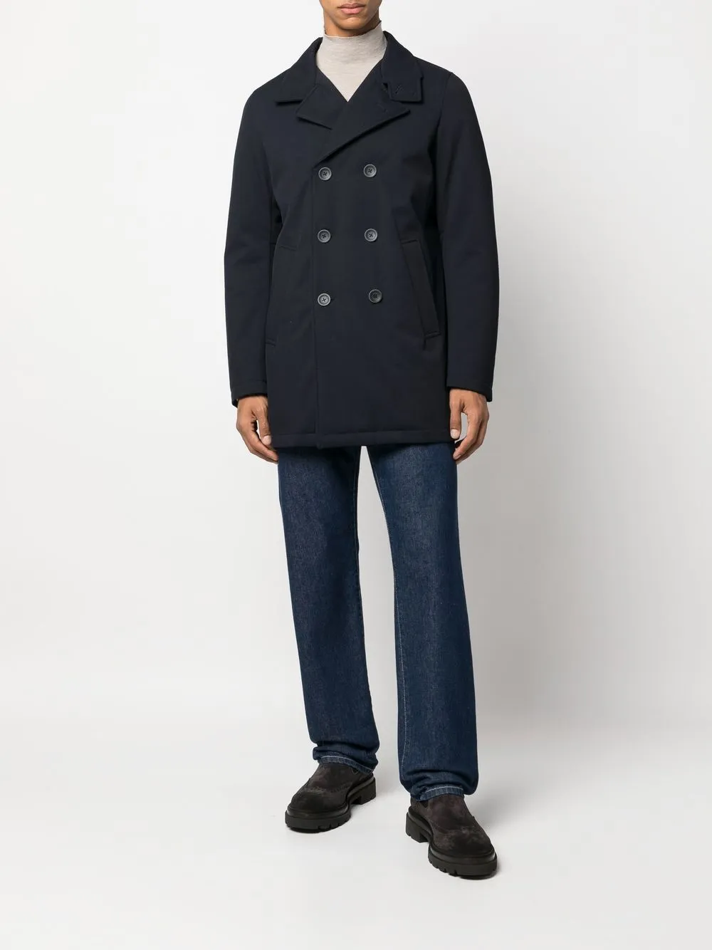 ネイビー、フェザーダウンの中綿、ダブルブレストボタン留め、スタンドカラー、サイドにウェルトポケット x 2、ロングスリーブ、ストレートな裾、センターベント、ひざ上丈。