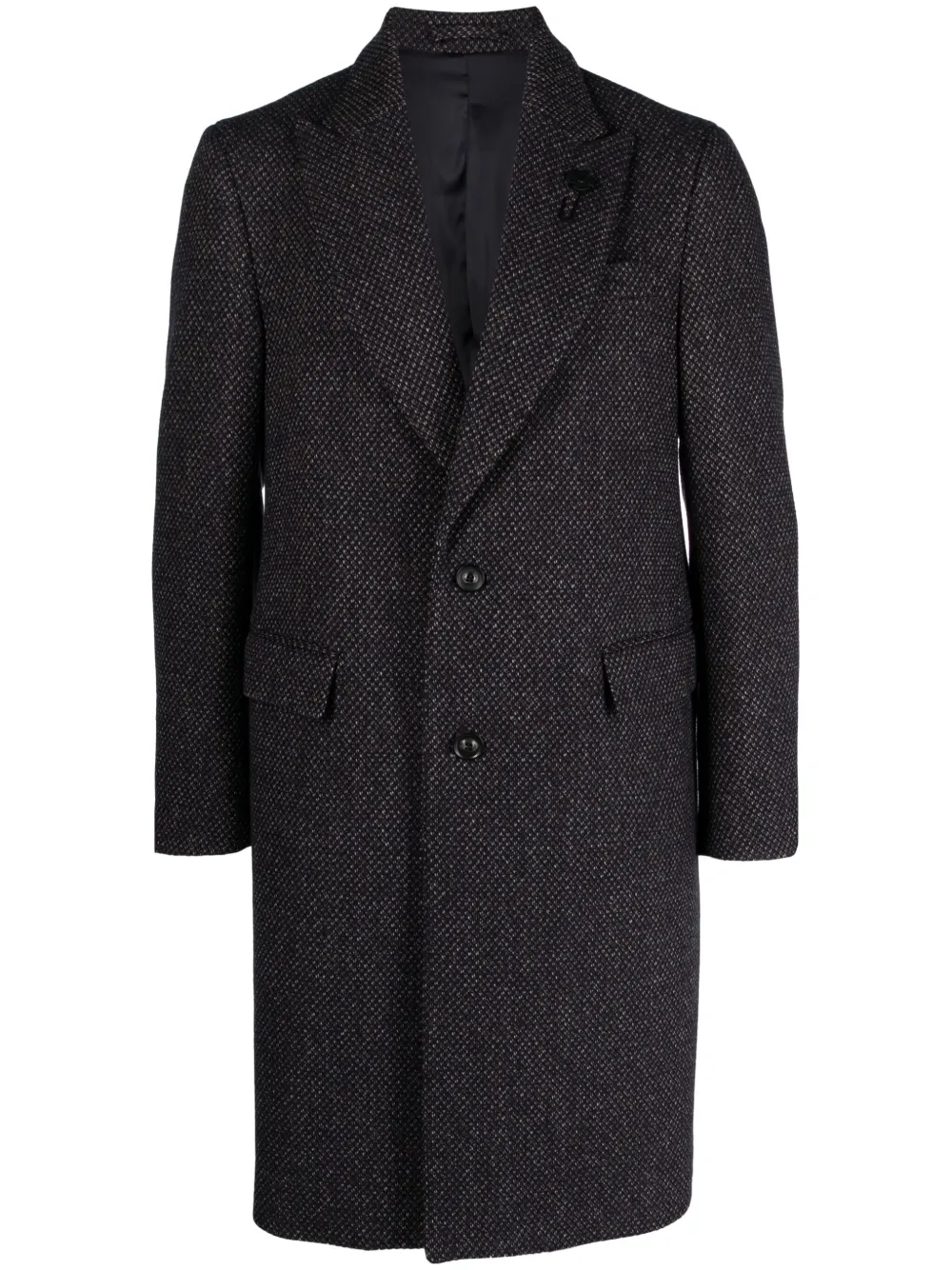 ダークパープル、ゴールドブラウン、クリームホワイト、ウールブレンド、パターンジャカード、ブローチディテール、ピークドラペル、フロントにボタン留め、ロングスリーブ、袖口にボタン留め、胸元にウェルトポケット、サイドにフラップポケット x 2、総裏地、内側にロゴパッチ、内側にダブルパイピングポケット、センターベント、ストレートな裾、ミドル丈。