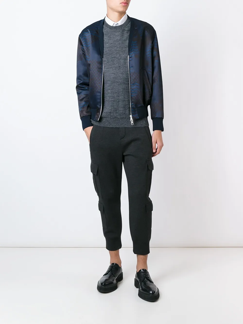 Neil Barrett (ニール・バレット)の、ミックスプリント ボンバージャケット(ネイビー)。クルーネック、長袖、前面にファスナー、サイドポケット、リブ編みの裾とカフス。