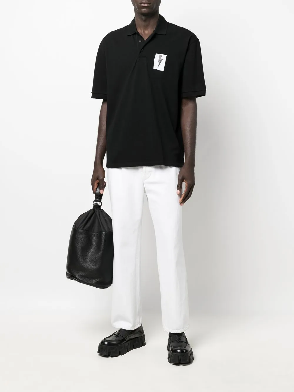 ブラック、コットン、ニット、スプレッドカラー、胸元にロゴパッチ、ストレートな裾、ショートスリーブ。