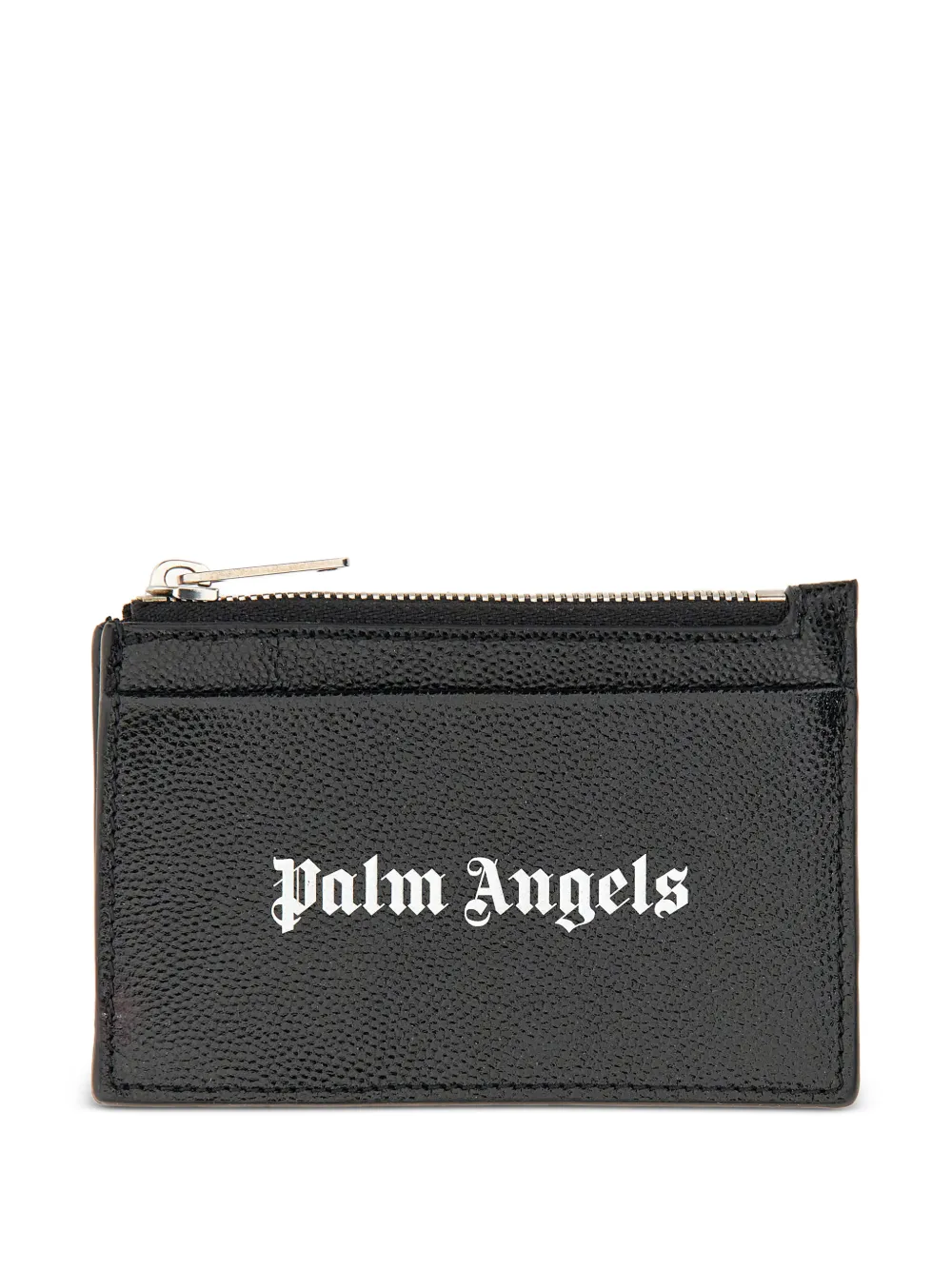 ブラック&ホワイト、カーフレザー、フロントにロゴプリント、シルバートーンの金具、フロントにスリップポケット、バックにカードスロット、トップにジップ式開閉、内側にロゴ。