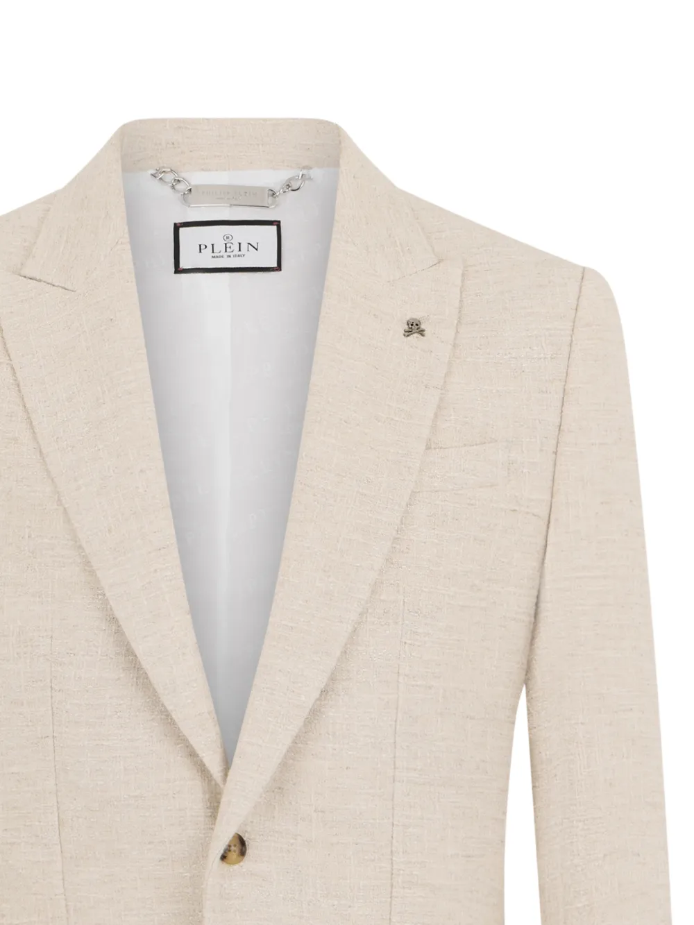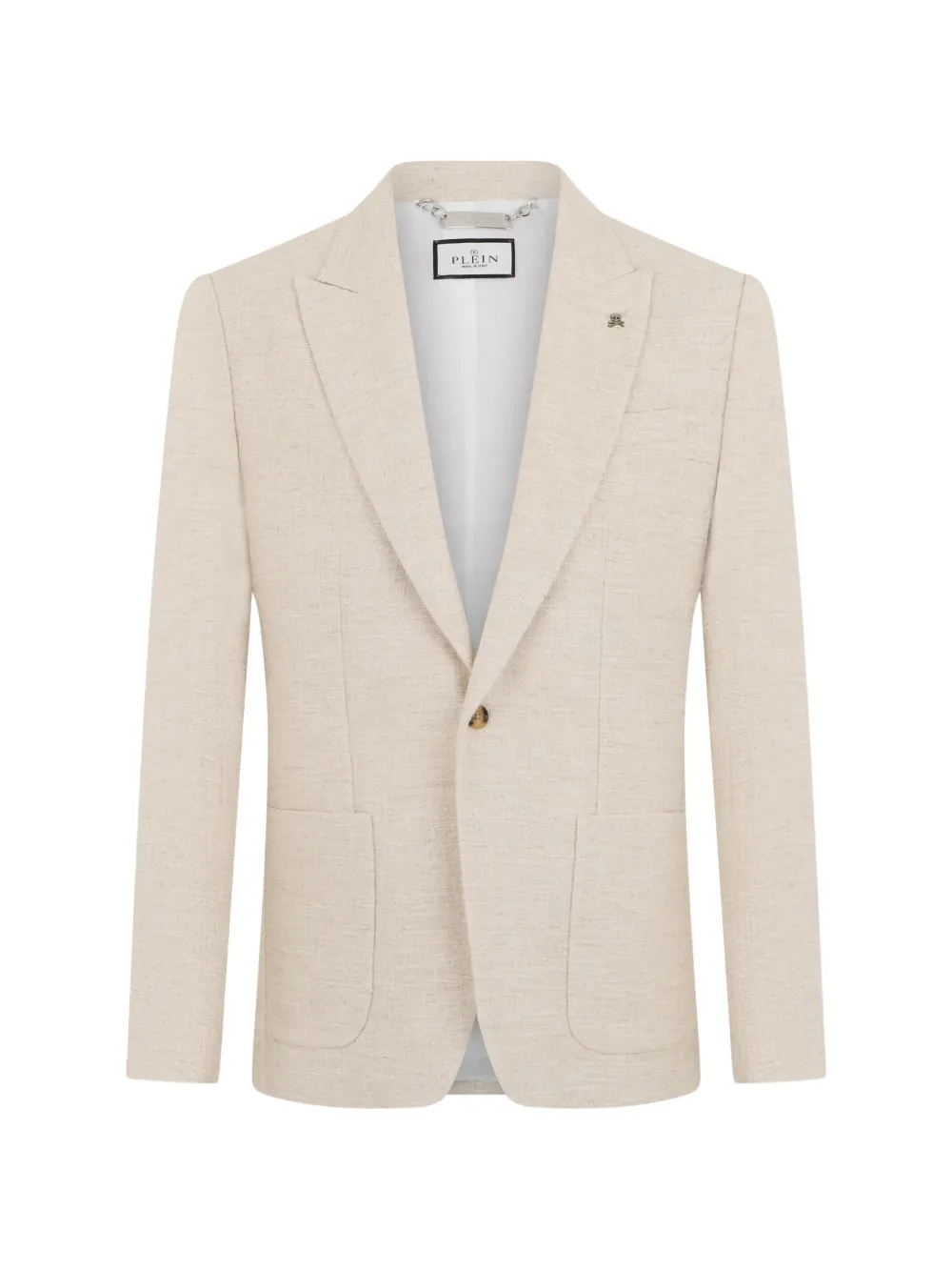 off-white slub texture peak lapels front button fastening chest patch pocket two front patch pockets long sleeves skull pin detail